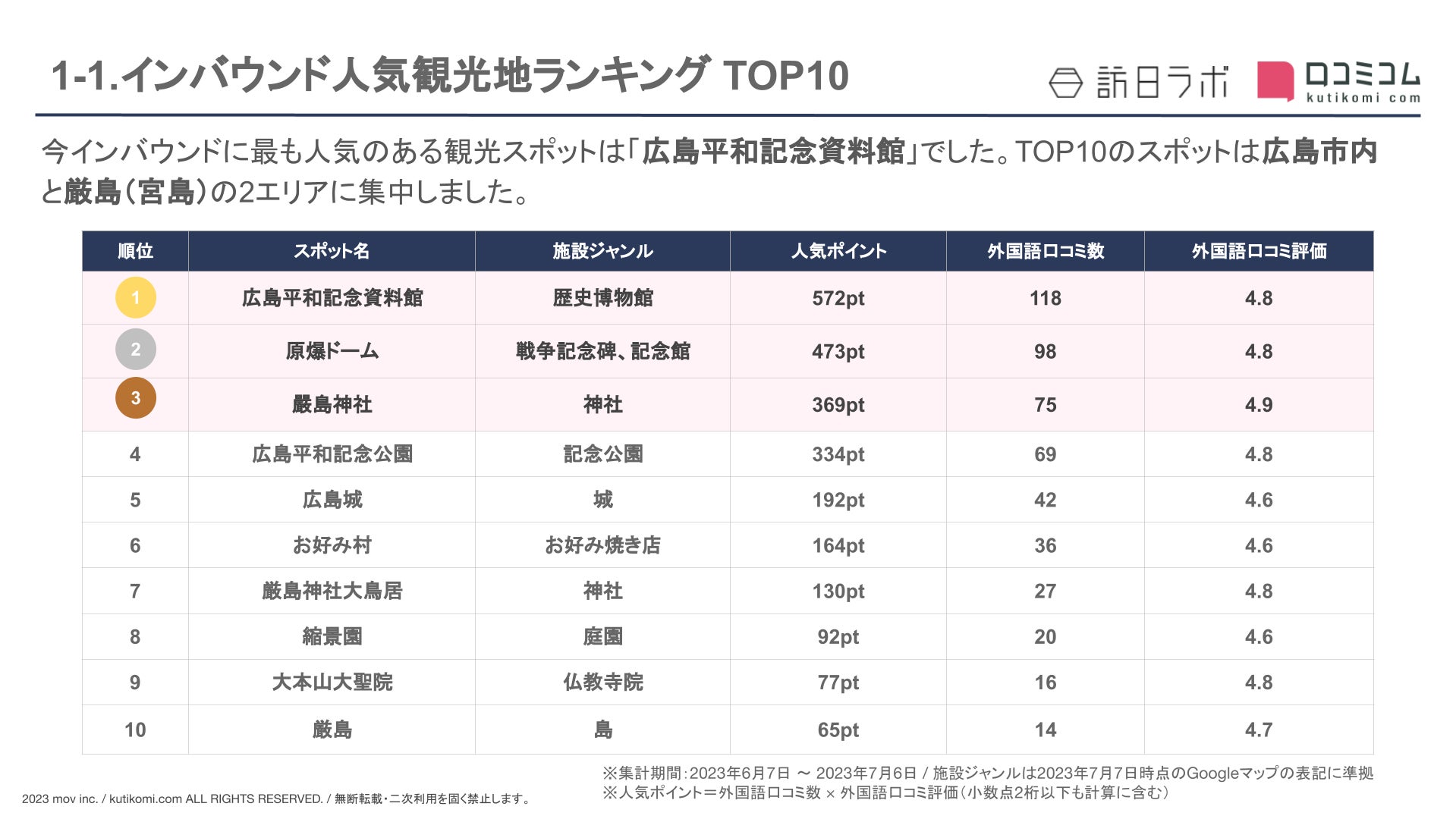 今インバウンドに最も人気のある観光スポットは「広島平和記念資料館」でした。TOP10のスポットは広島市内と厳島(宮島)の2エリアに集中しました。
