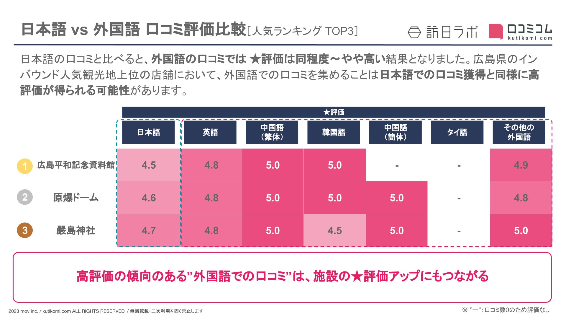 日本語の口コミと比べると、外国語の口コミでは★評価は同程度〜やや高い結果となりました。広島県のインバウンド人気観光地上位の店舗において、外国語での口コミを集めることは日本語での口コミ獲得と同様に高評価が得られる可能性があります。