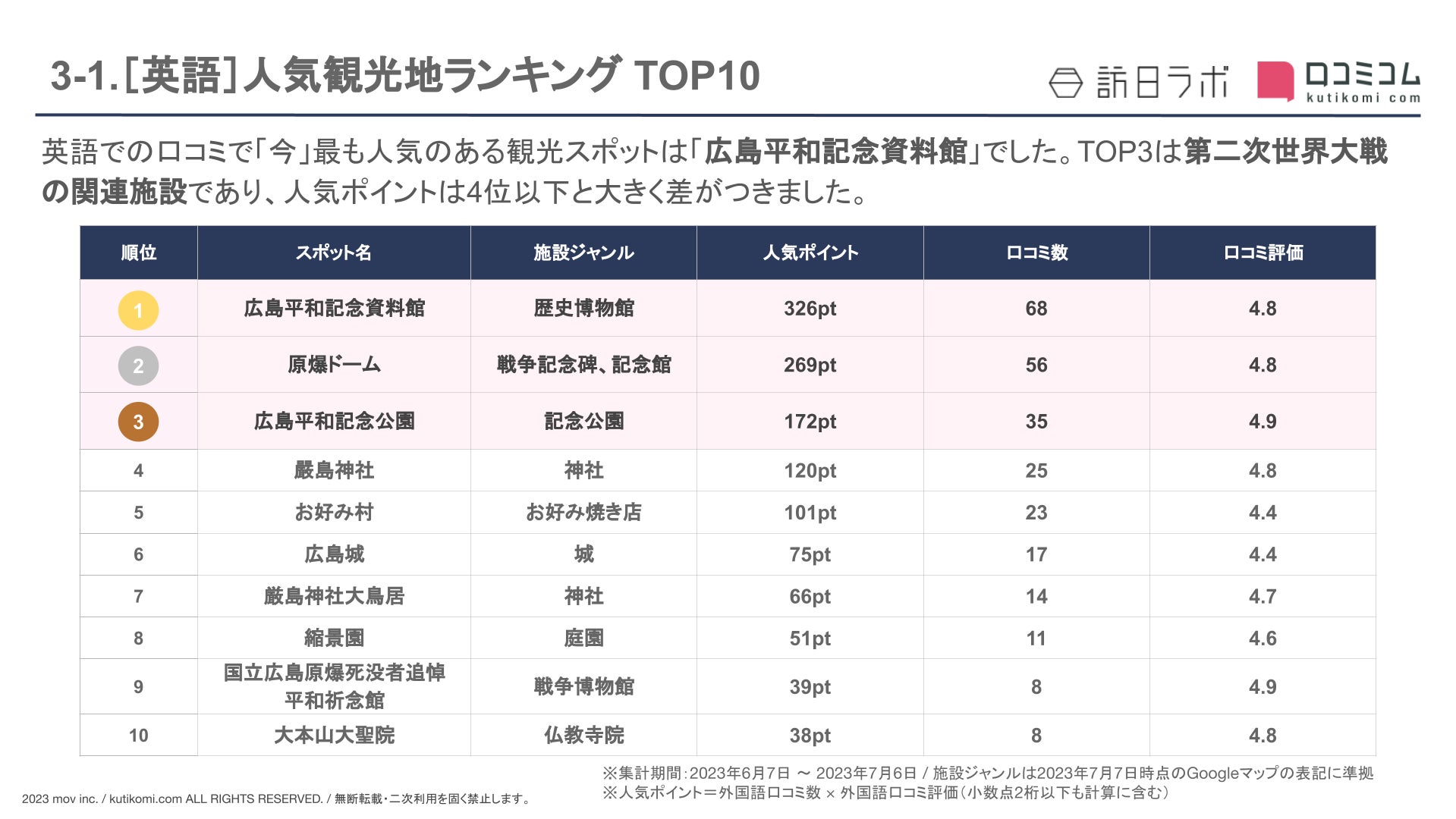 国内最大級メディア『訪日ラボ』及び 口コミサイトを”もっと”売上に変える店舗支援SaaS「口コミコム」を運営する株式会社mov(代表取締役:渡邊 誠、本社:東京都渋谷区、以下mov)は、観光名所に寄せられた最新の口コミデータから、独自の『インバウンド人気観光地ランキング』を発表しました。