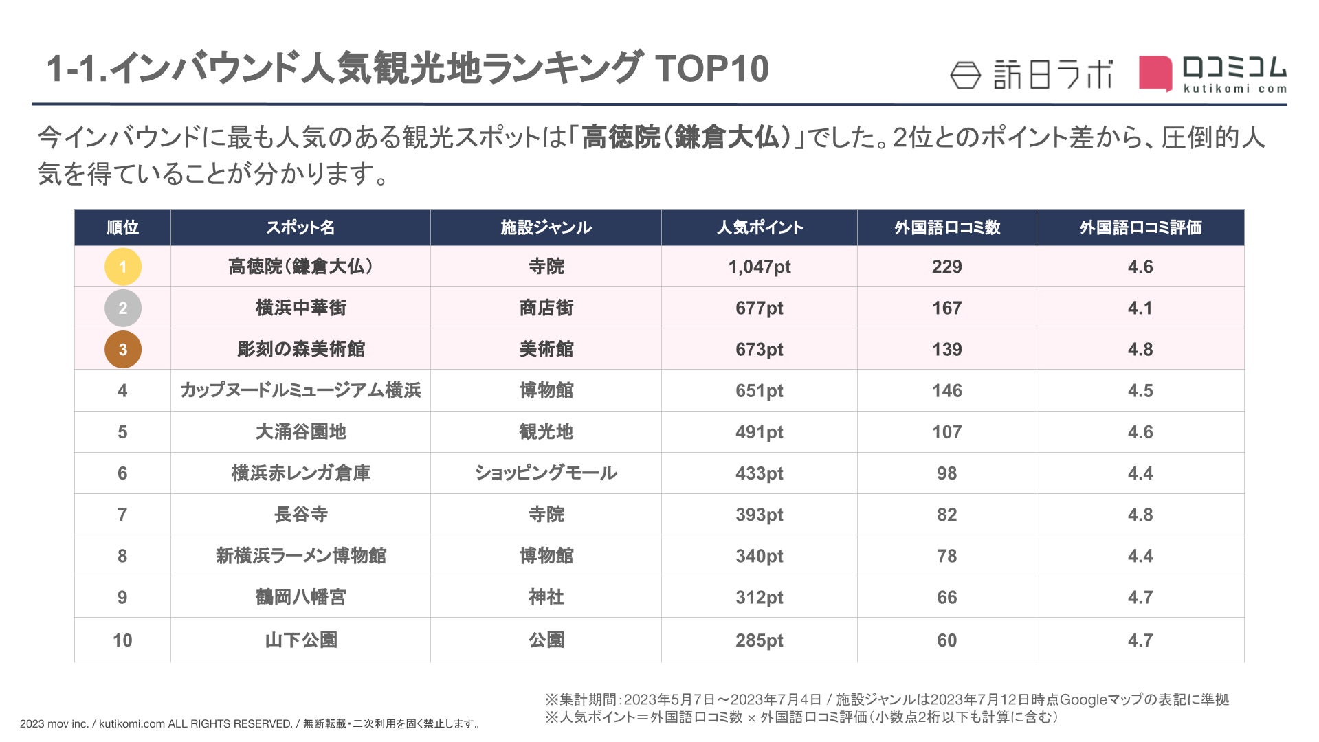 国内最大級メディア『訪日ラボ』及び 口コミサイトを”もっと”売上に変える店舗支援SaaS「口コミコム」を運営する株式会社mov(代表取締役:渡邊 誠、本社:東京都渋谷区、以下mov)は、観光名所に寄せられた最新の口コミデータから、独自の『インバウンド人気観光地ランキング』を発表しました。