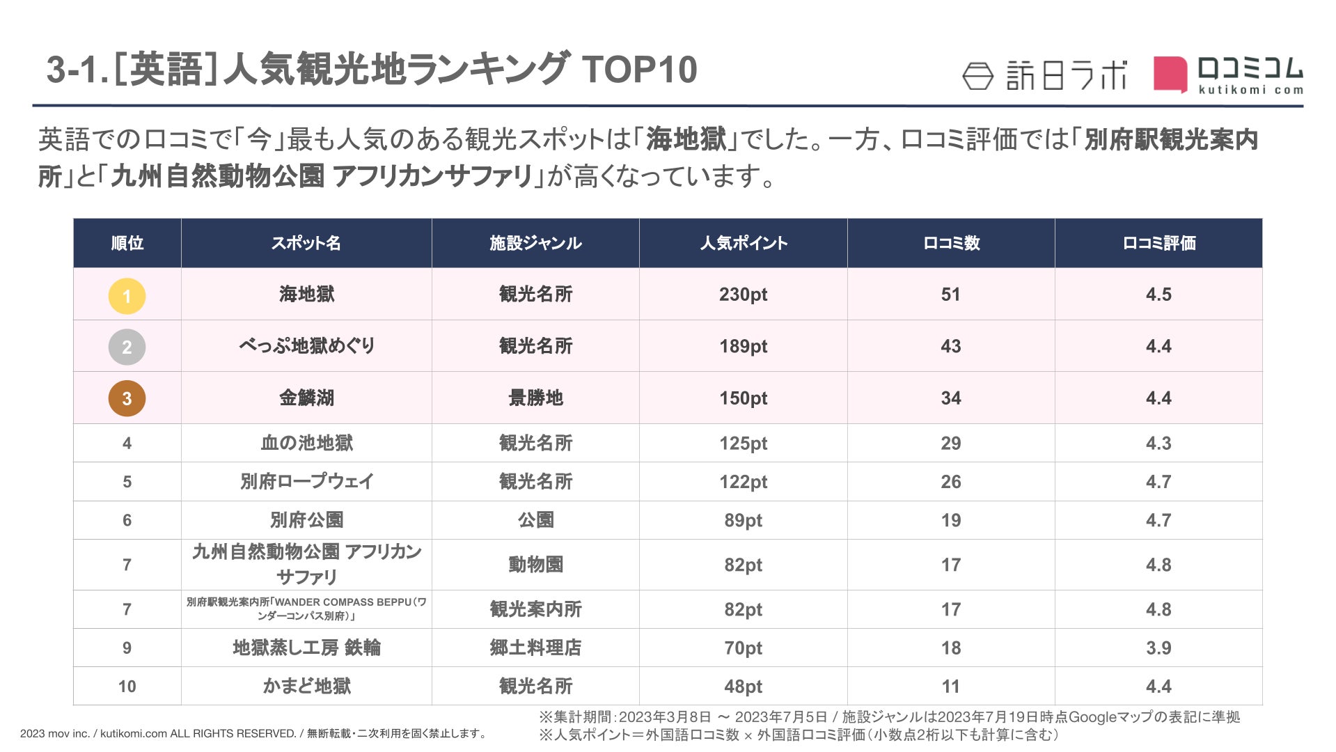 英語での口コミで「今」最も人気のある観光スポットは「海地獄」でした。口コミ評価では「別府駅観光案内所」と「九州自然動物公園 アフリカンサファリ」が高くなっています。