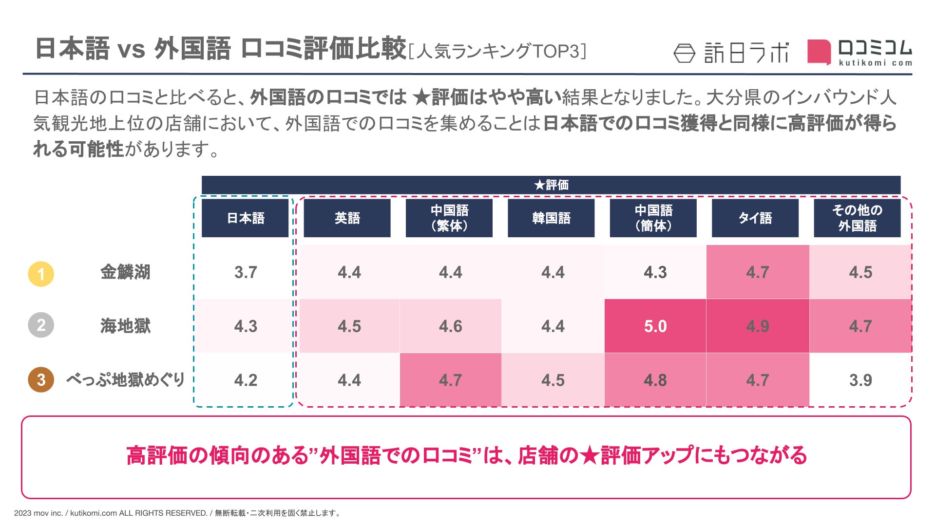 日本語の口コミと比べると、外国語の口コミでは★評価は同程度〜やや高い結果となりました。大分県のインバウンド人気観光地上位の店舗において、外国語での口コミを集めることは日本語での口コミ獲得と同様に高評価が得られる可能性があります。