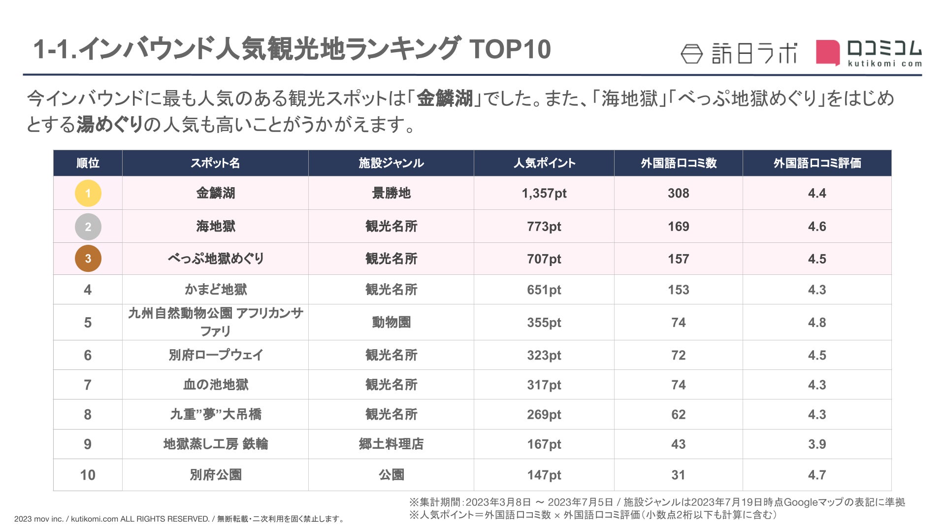 国内最大級メディア『訪日ラボ』及び 口コミサイトを”もっと”売上に変える店舗支援SaaS「口コミコム」を運営する株式会社mov(代表取締役:渡邊 誠、本社:東京都渋谷区、以下mov)は、観光名所に寄せられた最新の口コミデータから、独自の『インバウンド人気観光地ランキング』を発表しました。