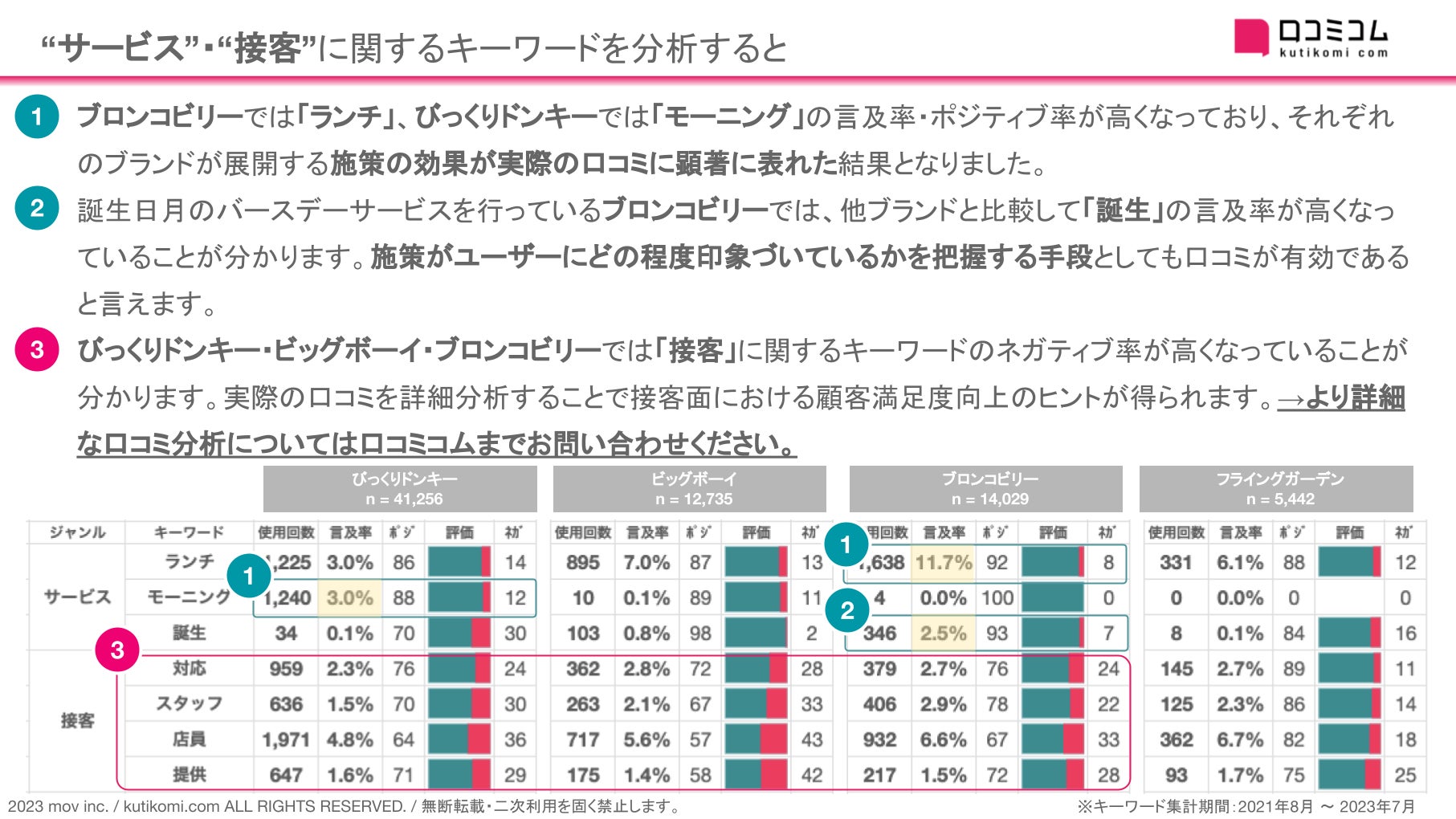 びっくりドンキー・ビッグボーイ・ブロンコビリーでは「接客」に関するキーワードのネガティブ率が高くなっていることが分かります。実際の口コミを詳細分析することで接客面における顧客満足度向上のヒントが得られます。→より詳細な口コミ分析については口コミコムまでお問い合わせください。
