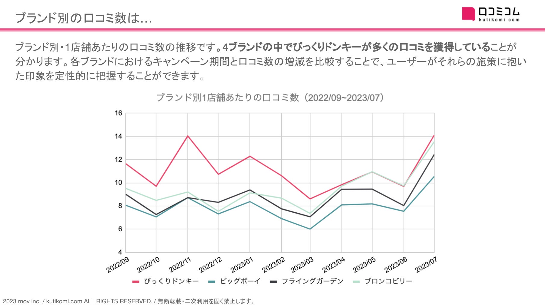 ブランド別・1店舗あたりの口コミ数の推移です。4ブランドの中でびっくりドンキーが多くの口コミを獲得していることが分かります。各ブランドにおけるキャンペーン期間と口コミ数の増減を比較することで、ユーザーがそれらの施策に抱いた印象を定性的に把握することができます。