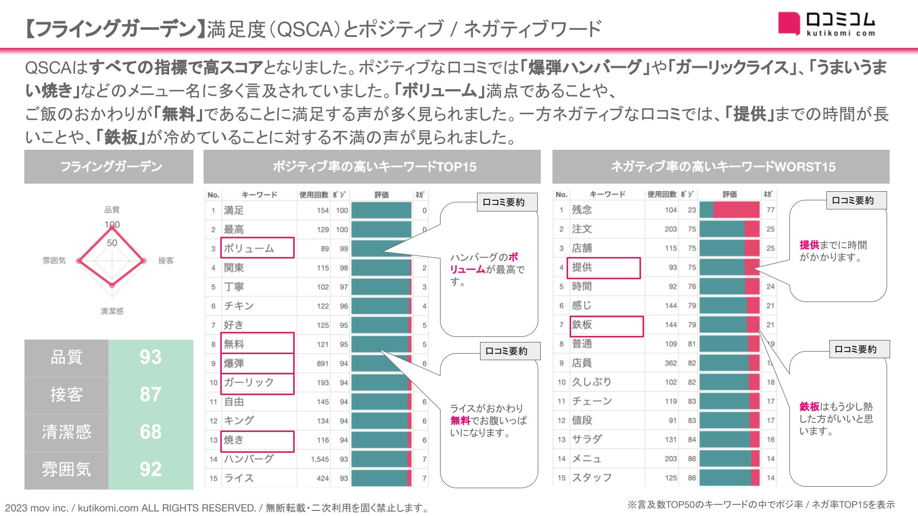 今回は、このAI解析を用いて【フライングガーデン】 のQSCA・ポジ / ネガキーワードを確認しました。