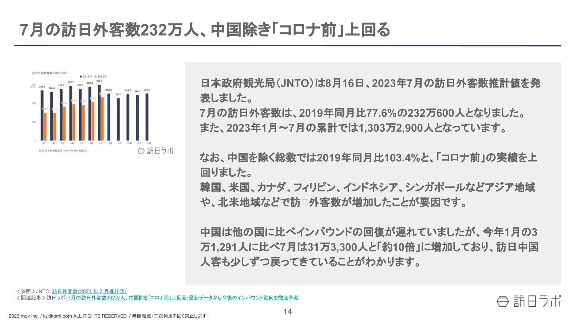国内最大級のインバウンド総合メディア「訪日ラボ」を運営する株式会社mov(代表取締役:渡邊 誠、本社:東京都渋谷区、以下mov)は、「インバウンドに関連する政府&自治体などの取り組み」「各国の出入国の動向」を始め、インバウンド対策に役立つニュースをまとめた「インバウンド動向まとめ【2023年7月〜8月版】」を公開しました。
