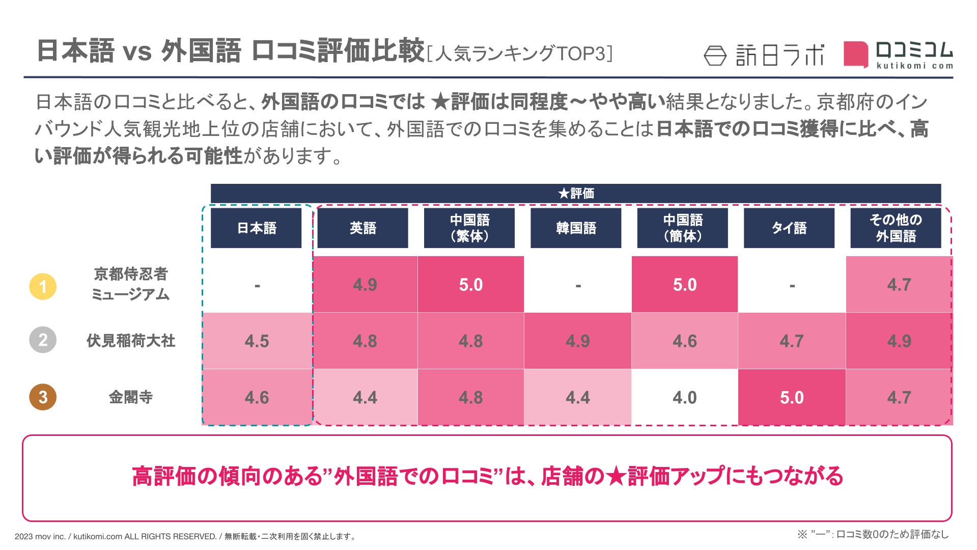 日本語の口コミと比べると、外国語の口コミでは★評価は同程度〜やや高い結果となりました。京都府のインバウンド人気観光地上位の店舗において、外国語での口コミを集めることは日本語での口コミ獲得に比べ、高評価が得られる可能性があります。