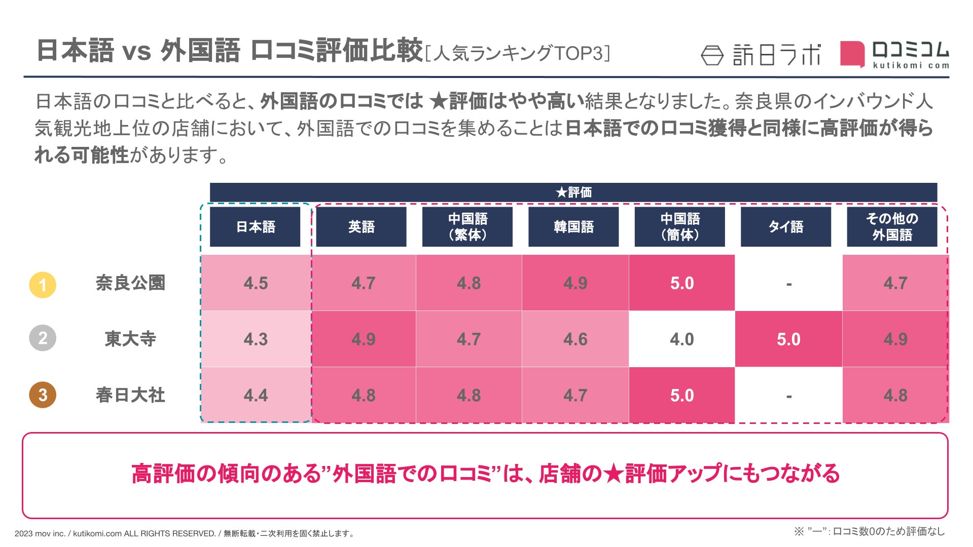 日本語の口コミと比べると、外国語の口コミでは★評価は同程度〜やや高い結果となりました。奈良県のインバウンド人気観光地上位の店舗において、外国語での口コミを集めることは日本語での口コミ獲得と同様に高評価が得られる可能性があります。
