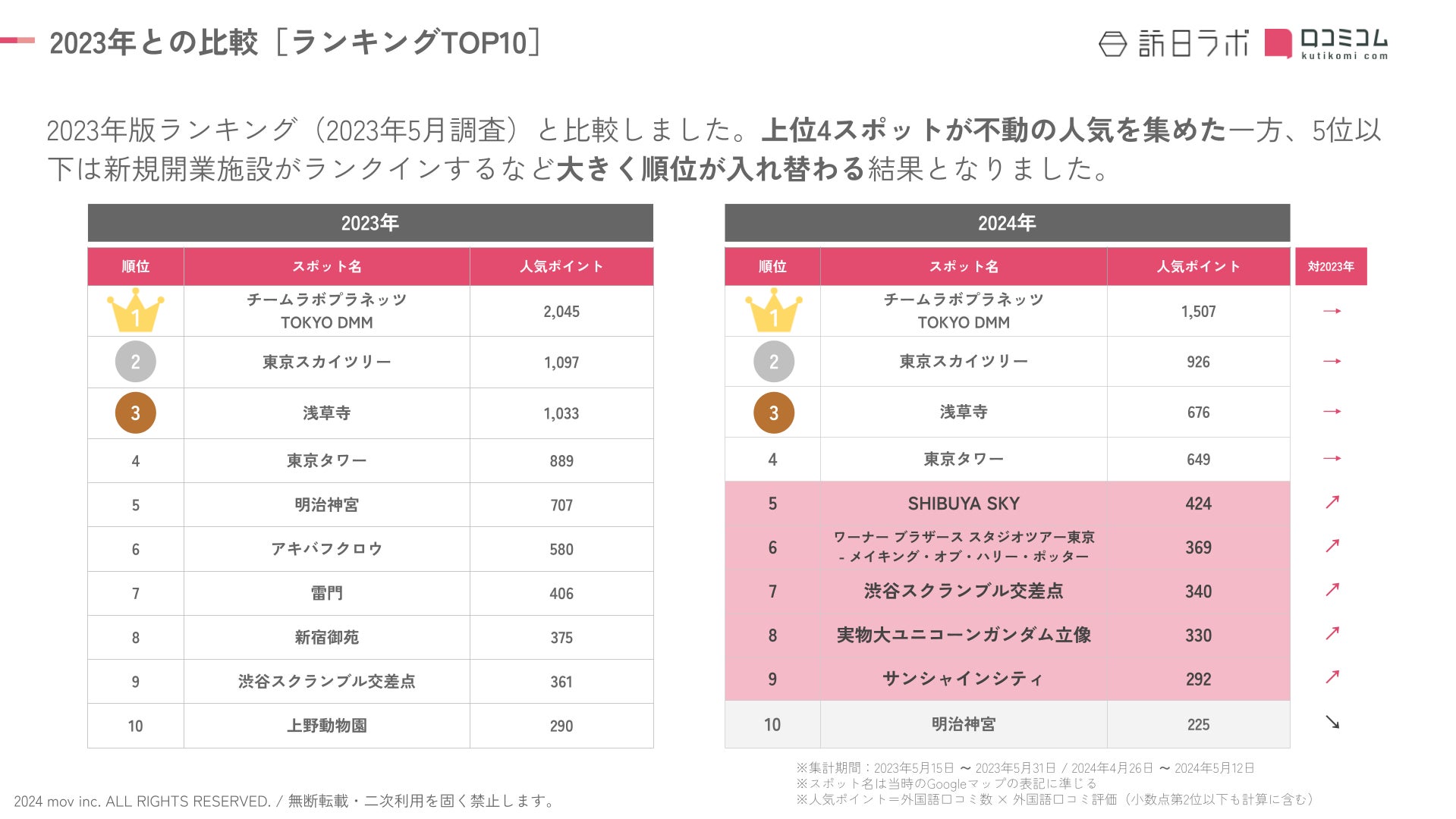 「チームラボプラネッツ TOKYO DMM」ほか上位4スポットが不動の人気を集めた一方、5位以下は新規開業施設がランクインするなど大きく順位が入れ替わる結果となりました。