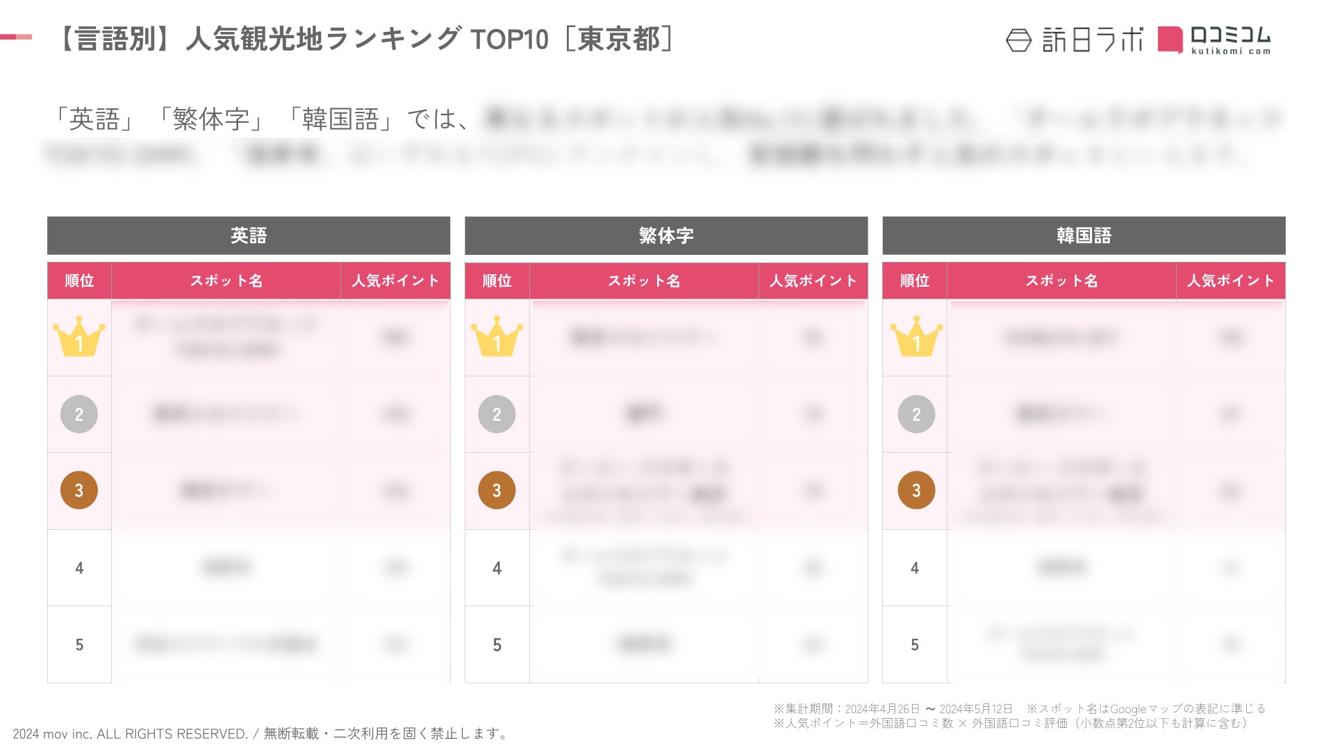 「英語」「繁体字」「韓国語」では、それぞれ異なるスポットがNo.1に選ばれました。