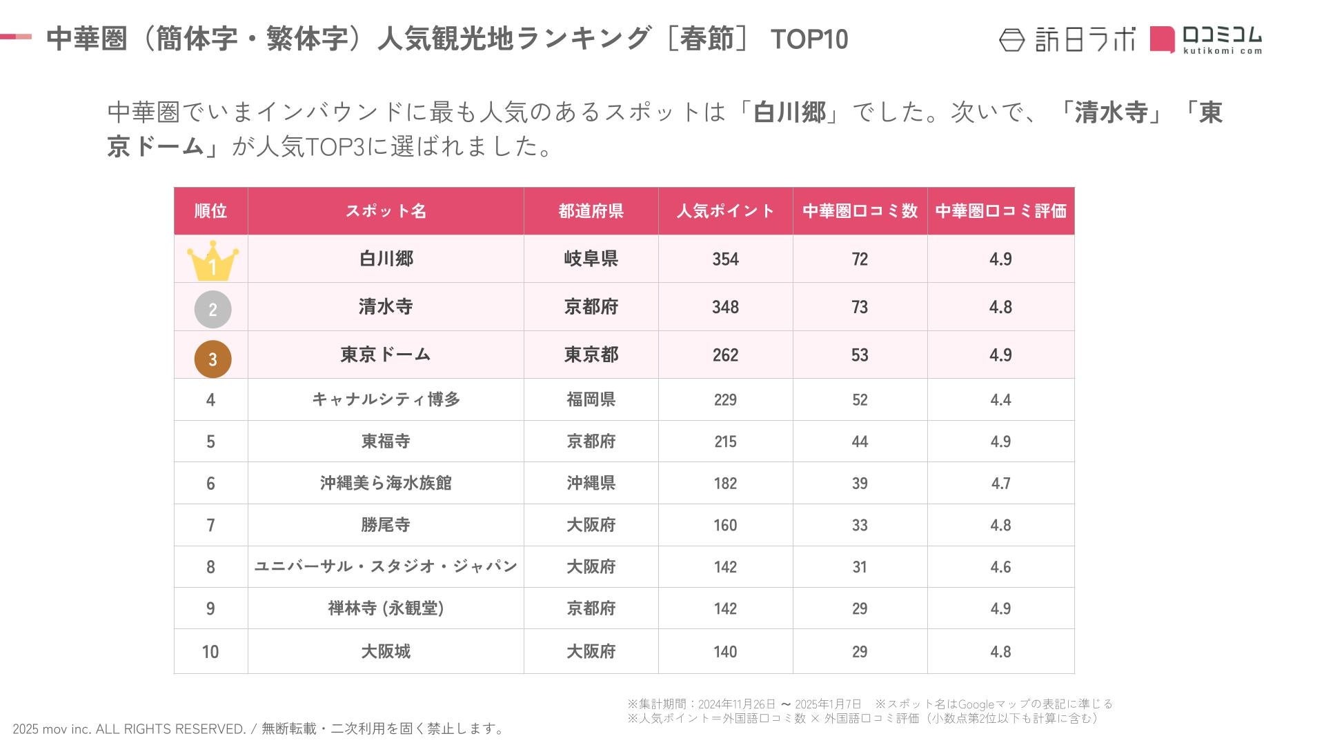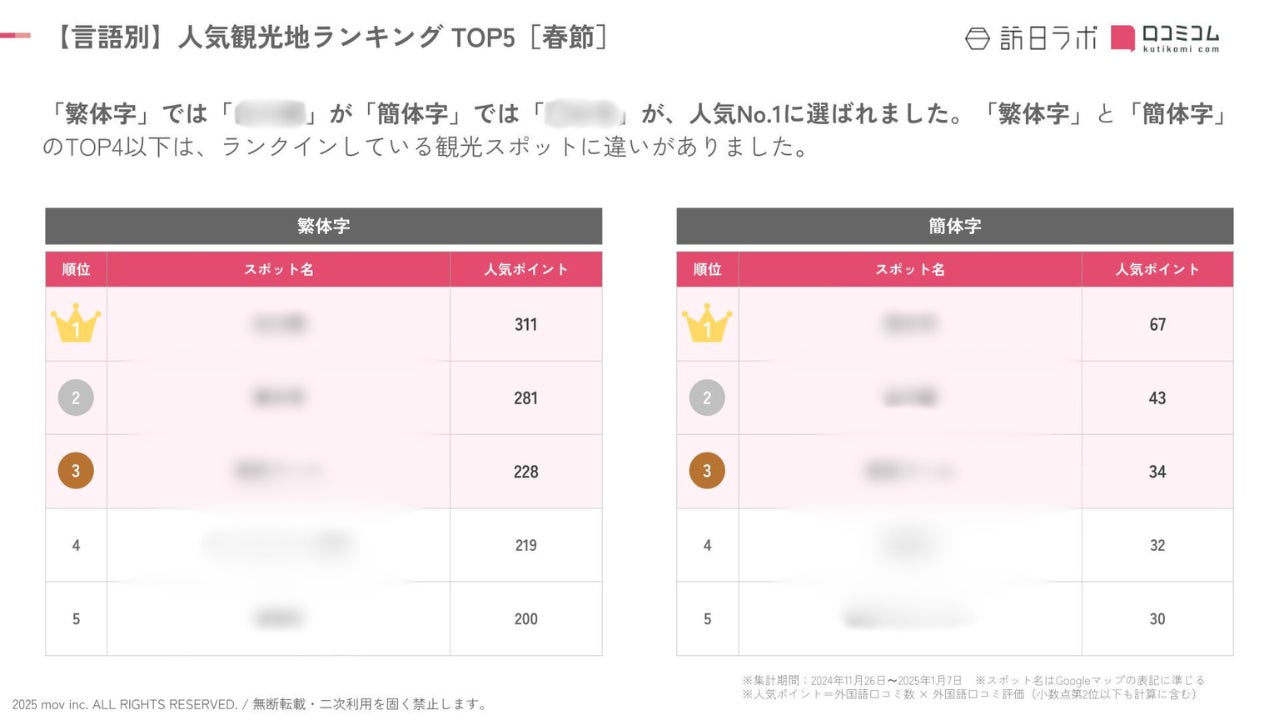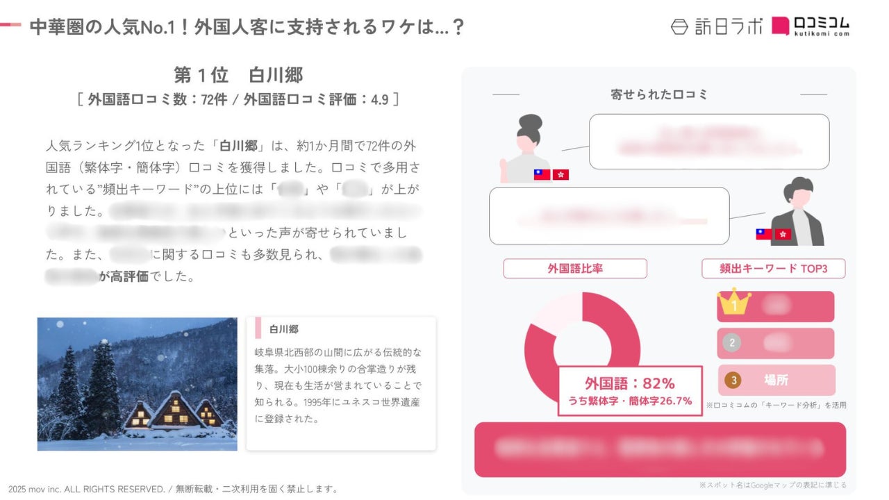 業界最大級のインバウンドビジネスメディア「訪日ラボ」及び 店舗向け集客一元化プラットフォーム「口コミコム」を運営する株式会社mov(代表取締役:渡邊 誠、本社:東京都渋谷区、以下mov)は、全国の観光スポットに寄せられた最新の中華圏口コミデータから、独自の『インバウンド人気観光地ランキング』を発表しました。