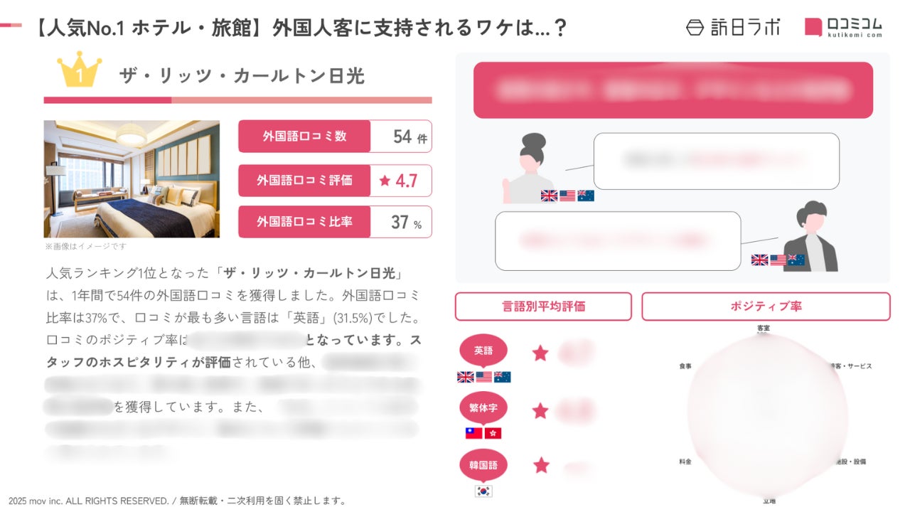 業界最大級のインバウンドビジネスメディア「訪日ラボ」及び 店舗向け集客一元化プラットフォーム「口コミコム」を運営する株式会社mov(代表取締役:渡邊 誠、本社:東京都渋谷区、以下mov)は、栃木県のホテル・旅館に寄せられた最新の口コミデータから、独自の『インバウンド人気ホテル・旅館ランキング』を発表しました。