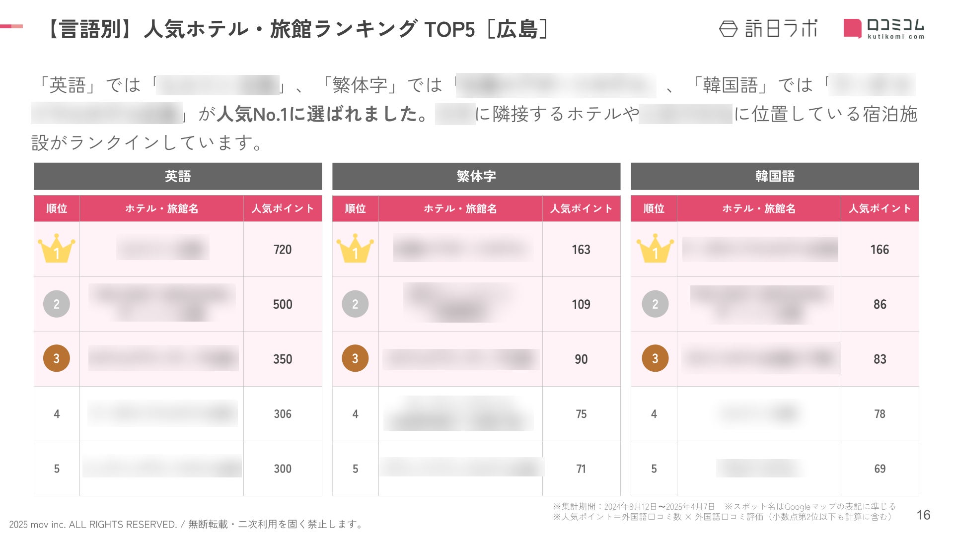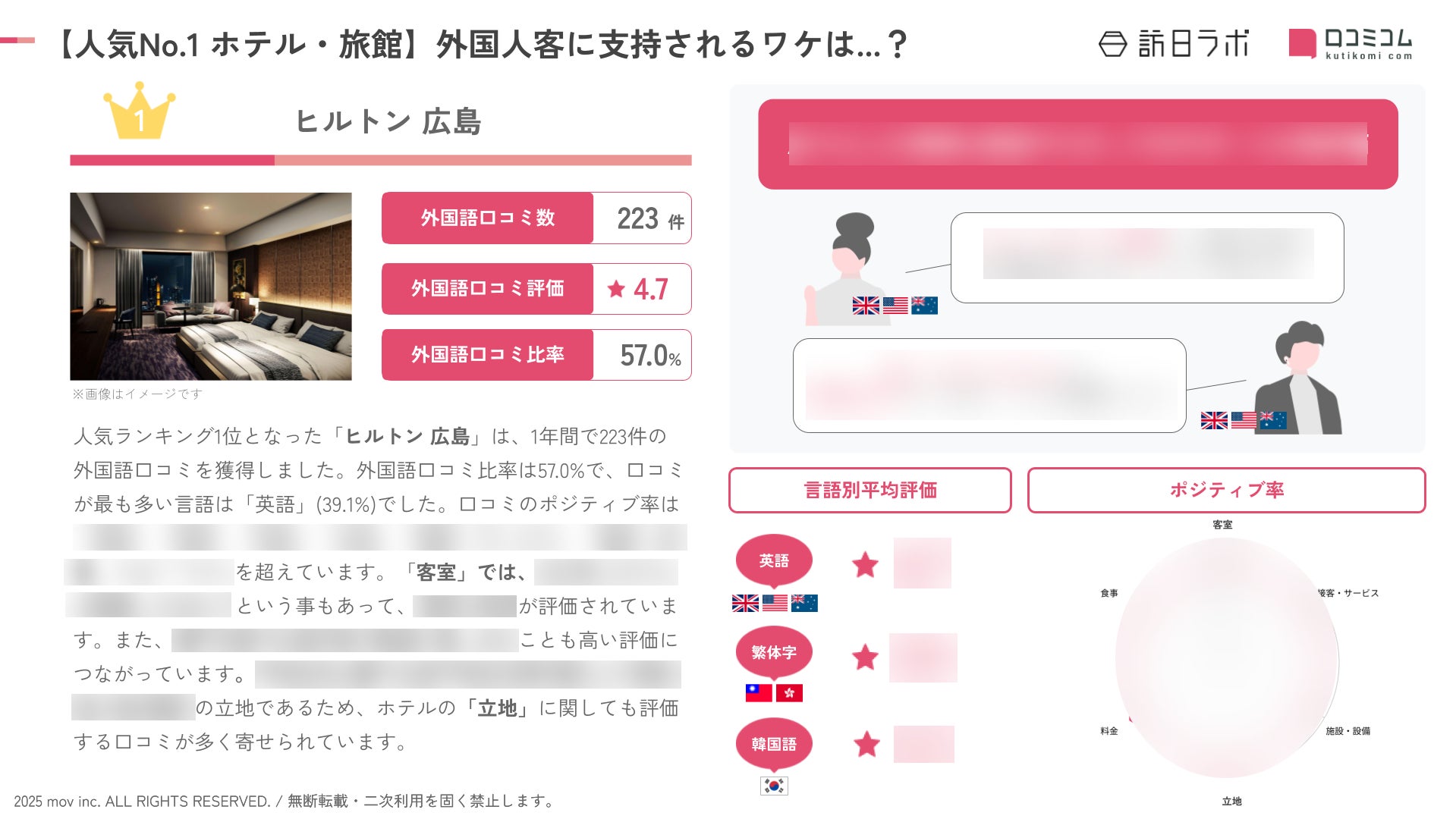 業界最大級のインバウンドビジネスメディア「訪日ラボ」及び 店舗向け集客一元化プラットフォーム「口コミコム」を運営する株式会社mov(代表取締役:渡邊 誠、本社:東京都渋谷区、以下mov)は、広島県のホテル・旅館に寄せられた最新の口コミデータから、独自の『インバウンド人気ホテル・旅館ランキング』を発表しました。