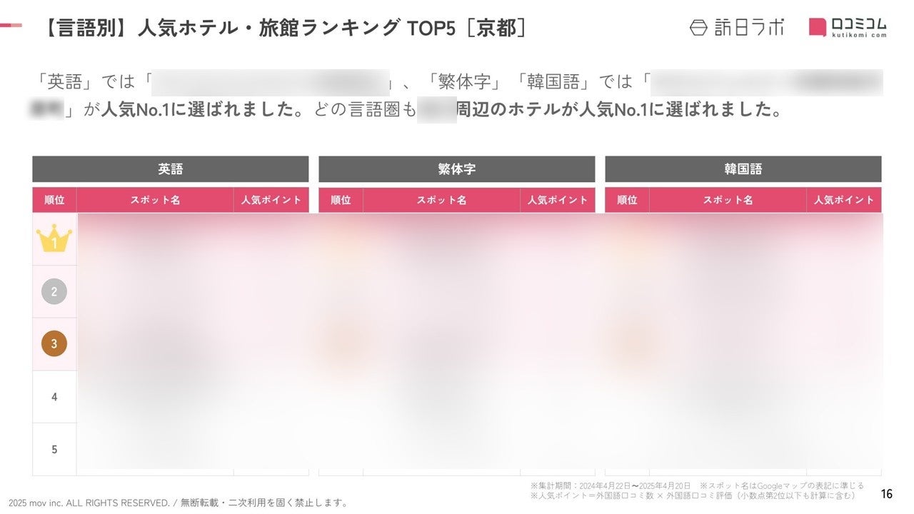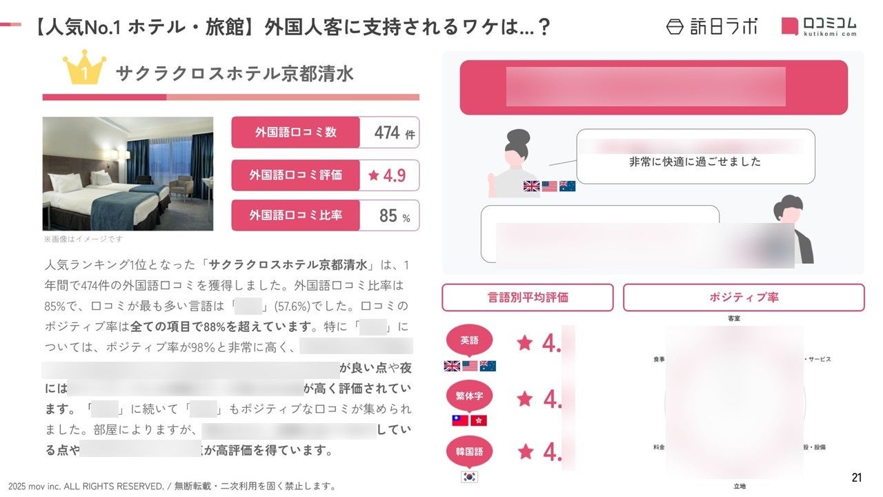 業界最大級のインバウンドビジネスメディア「訪日ラボ」及び 店舗向け集客一元化プラットフォーム「口コミコム」を運営する株式会社mov(代表取締役:渡邊 誠、本社:東京都渋谷区、以下mov)は、京都府のホテル・旅館に寄せられた最新の口コミデータから、独自の『インバウンド人気ホテル・旅館ランキング』を発表しました。