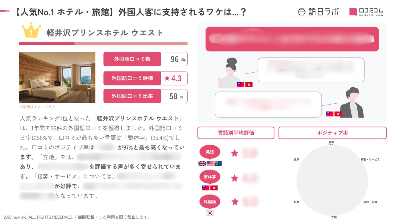 業界最大級のインバウンドビジネスメディア「訪日ラボ」及び 店舗向け集客一元化プラットフォーム「口コミコム」を運営する株式会社mov(代表取締役:渡邊 誠、本社:東京都渋谷区、以下mov)は、長野県のホテル・旅館に寄せられた最新の口コミデータから、独自の『インバウンド人気ホテル・旅館ランキング』を発表しました。