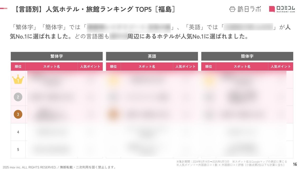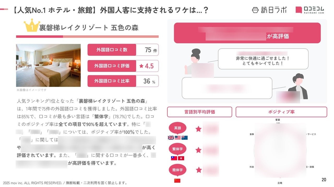 業界最大級のインバウンドビジネスメディア「訪日ラボ」及び 店舗向け集客一元化プラットフォーム「口コミコム」を運営する株式会社mov(代表取締役:渡邊 誠、本社:東京都渋谷区、以下mov)は、福島県のホテル・旅館に寄せられた最新の口コミデータから、独自の『インバウンド人気ホテル・旅館ランキング』を発表しました。