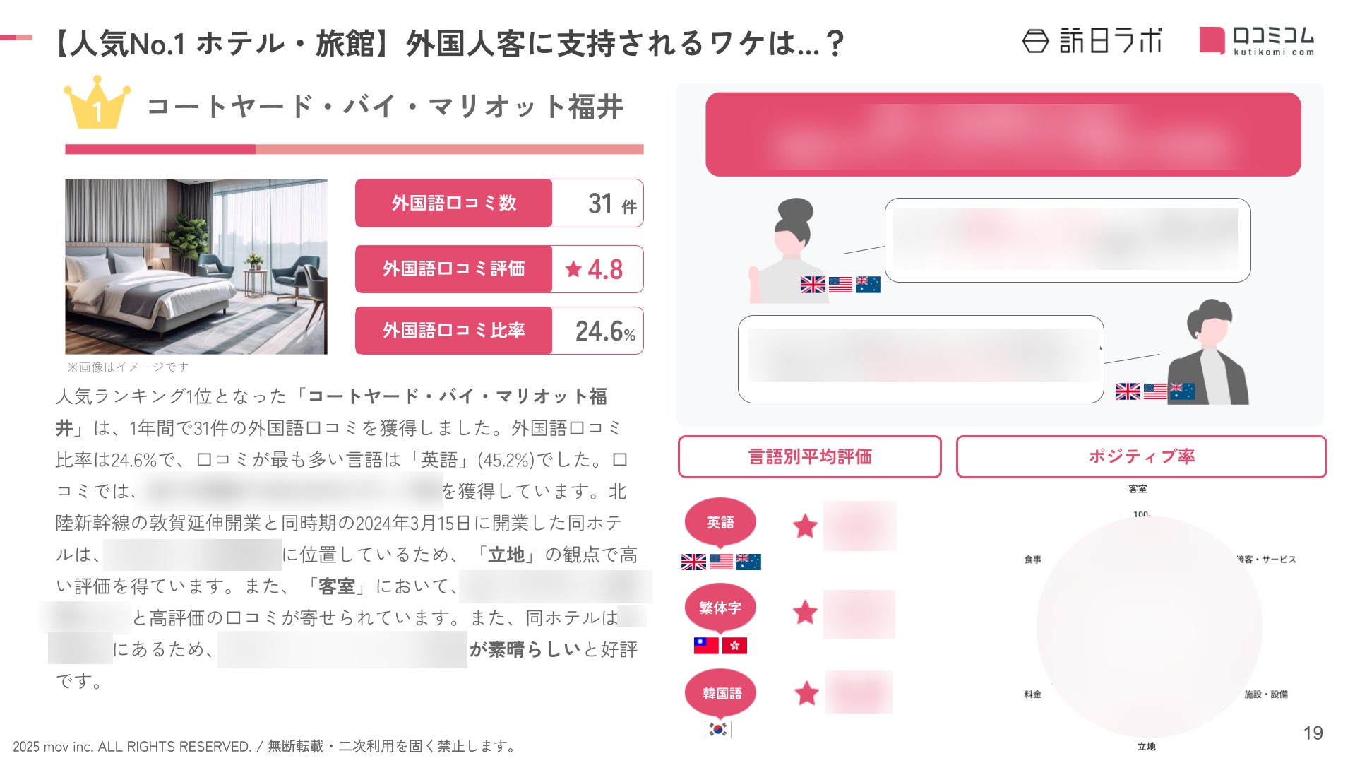 業界最大級のインバウンドビジネスメディア「訪日ラボ」及び 店舗向け集客一元化プラットフォーム「口コミコム」を運営する株式会社mov(代表取締役:渡邊 誠、本社:東京都渋谷区、以下mov)は、福井県のホテル・旅館に寄せられた最新の口コミデータから、独自の『インバウンド人気ホテル・旅館ランキング』を発表しました。