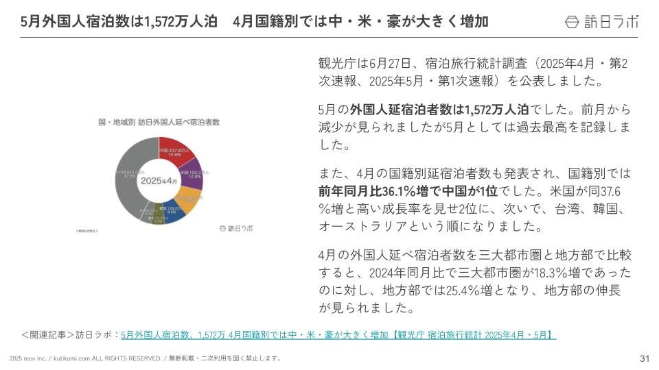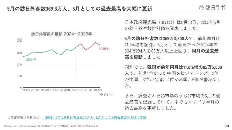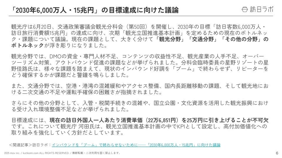 業界最大級のインバウンドビジネスメディア「訪日ラボ」及び 店舗向け集客一元化プラットフォーム「口コミコム」を運営する株式会社mov(代表取締役:渡邊 誠、本社:東京都渋谷区、以下mov)は、「インバウンドに関する最新トレンド・データ」「政府・自治体・企業などのインバウンド関連の取り組み」をはじめ、インバウンド対策に役立つニュースをまとめた「インバウンド情報まとめ【2025年6月後編】」を公開しました。