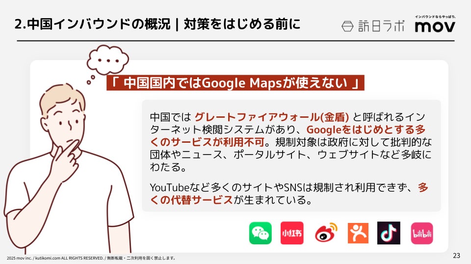 業界最大級のインバウンドビジネスメディア「訪日ラボ」及び 店舗向け集客一元化プラットフォーム「口コミコム」を運営する株式会社mov(代表取締役:渡邊 誠、本社:東京都渋谷区、以下mov)は、中国インバウンド向けの対策や概況をまとめた「インバウンドマーケティングのいろは〜中国編〜」を公開しました。