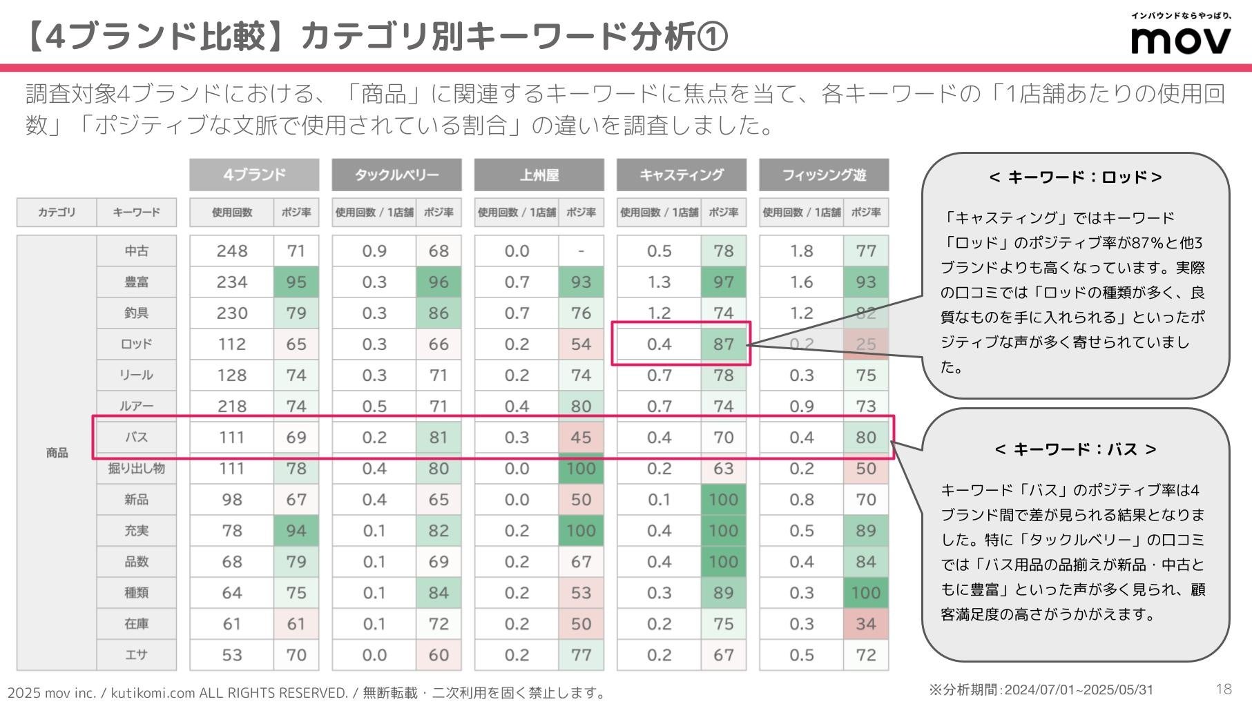キーワード「バス」のポジティブ率は4ブランド間で差が見られる結果となりました。特に「タックルベリー」の口コミでは「バス用品の品揃えが新品・中古ともに豊富」といった声が多く見られ、顧客満足度の高さがうかがえます。