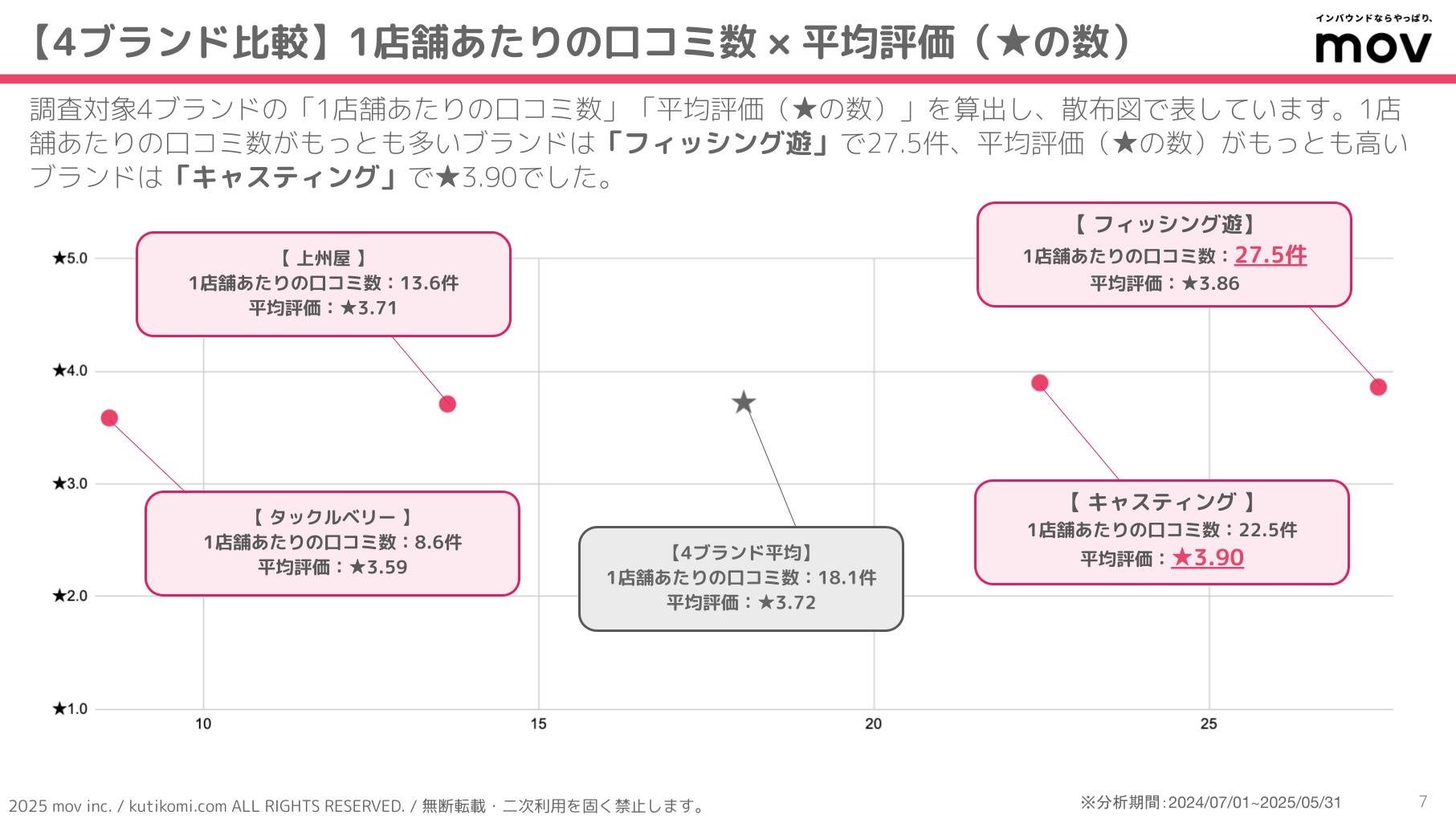 こちらの散布図では、調査対象4ブランドの「1店舗あたりの口コミ数」「平均評価(★の数)」を算出しています。1店舗あたりの口コミ数がもっとも多いブランドは「フィッシング遊」で27.5件、平均評価(★の数)がもっとも高いブランドは「キャスティング」で★3.90でした。