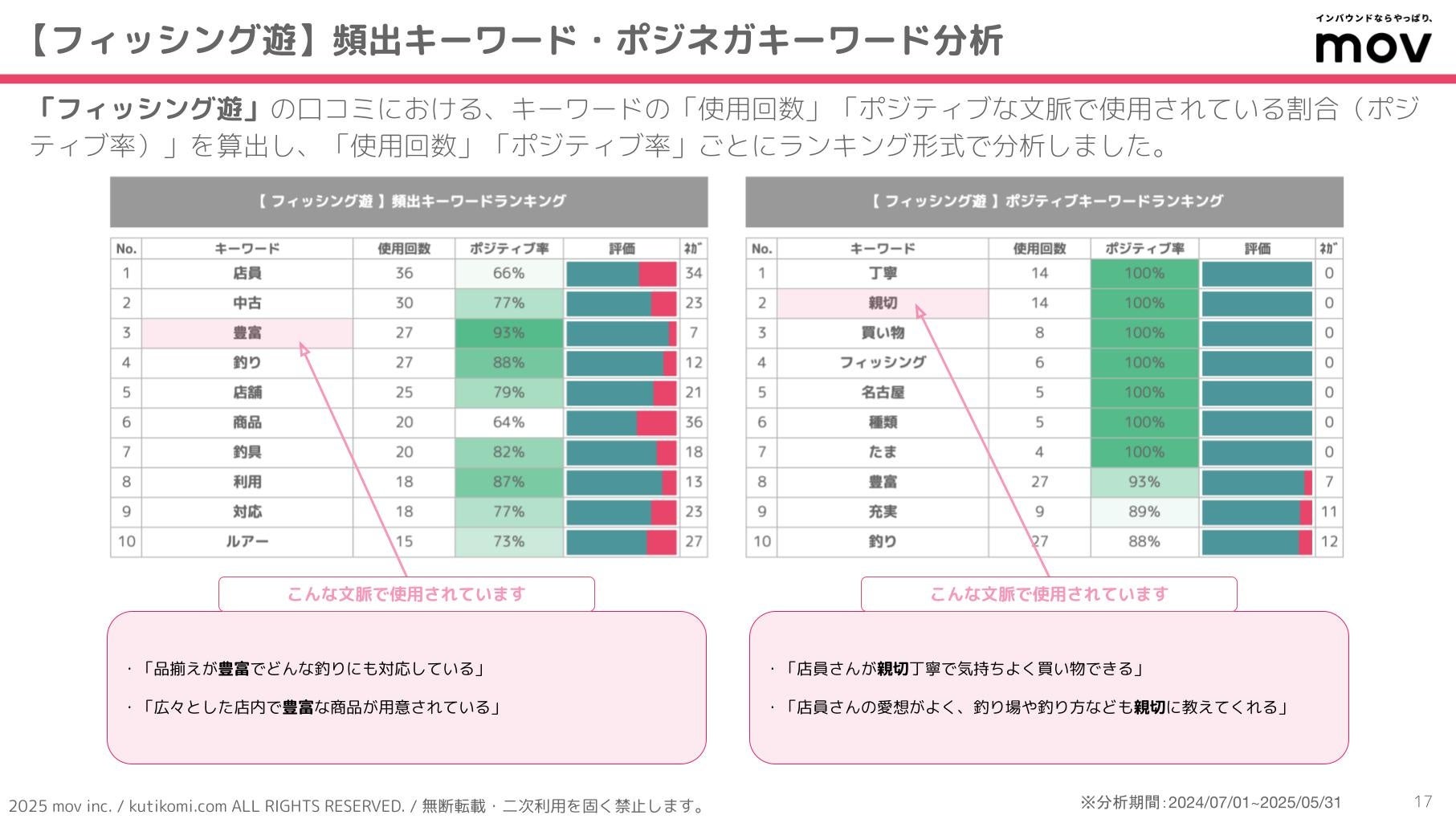 こちらの表では、「フィッシング遊」の口コミにおける、キーワードの「使用回数」「ポジティブな文脈で使用されている割合(ポジティブ率)」を算出し、「使用回数」「ポジティブ率」ごとにランキング形式で分析しています。