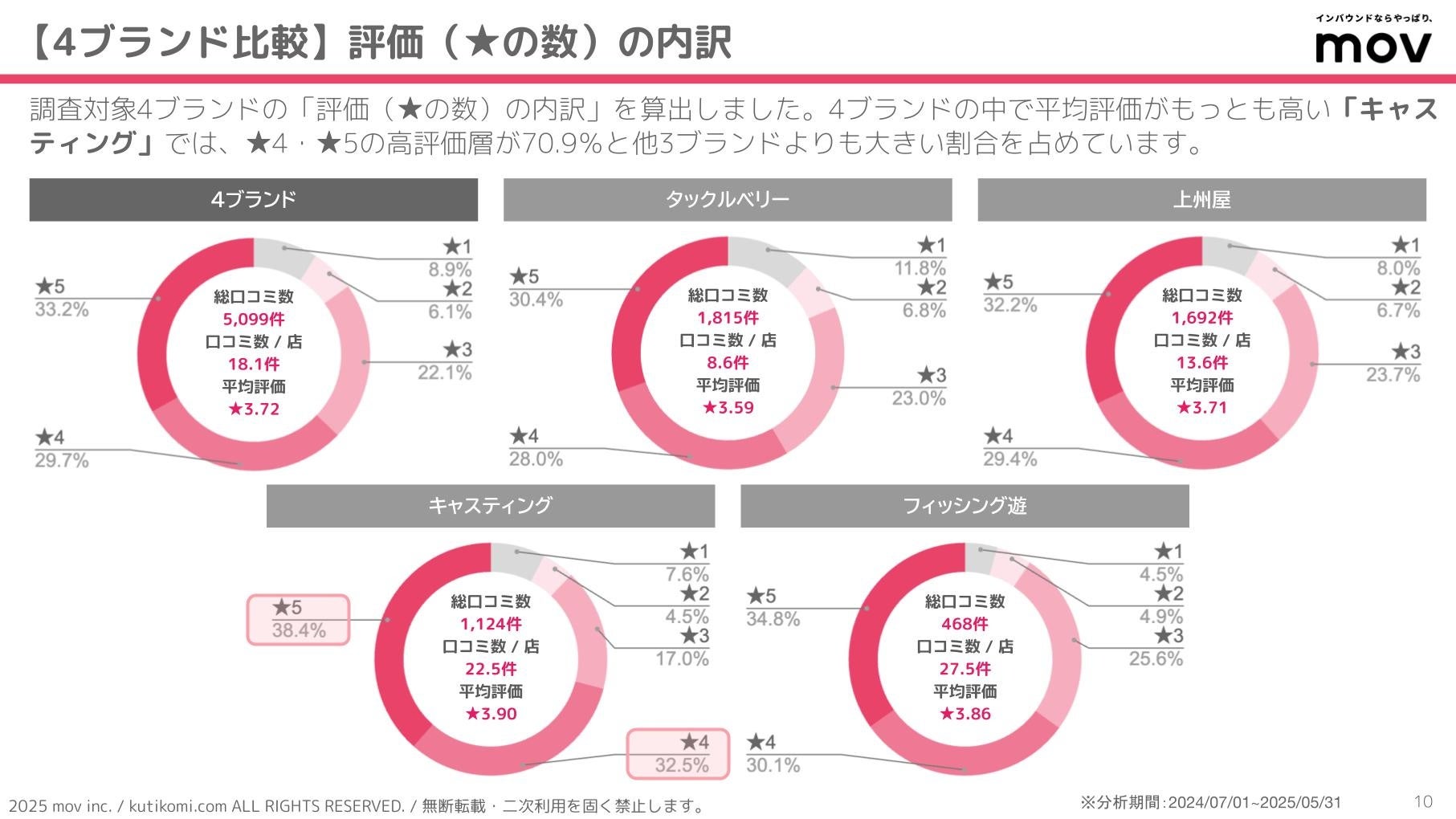 こちらのグラフでは、調査対象4ブランドの「評価(★の数)の内訳」を算出しています。4ブランドの中で平均評価がもっとも高い「キャスティング」では、★4・★5の高評価層が70.9%と他3ブランドよりも大きい割合を占めています。