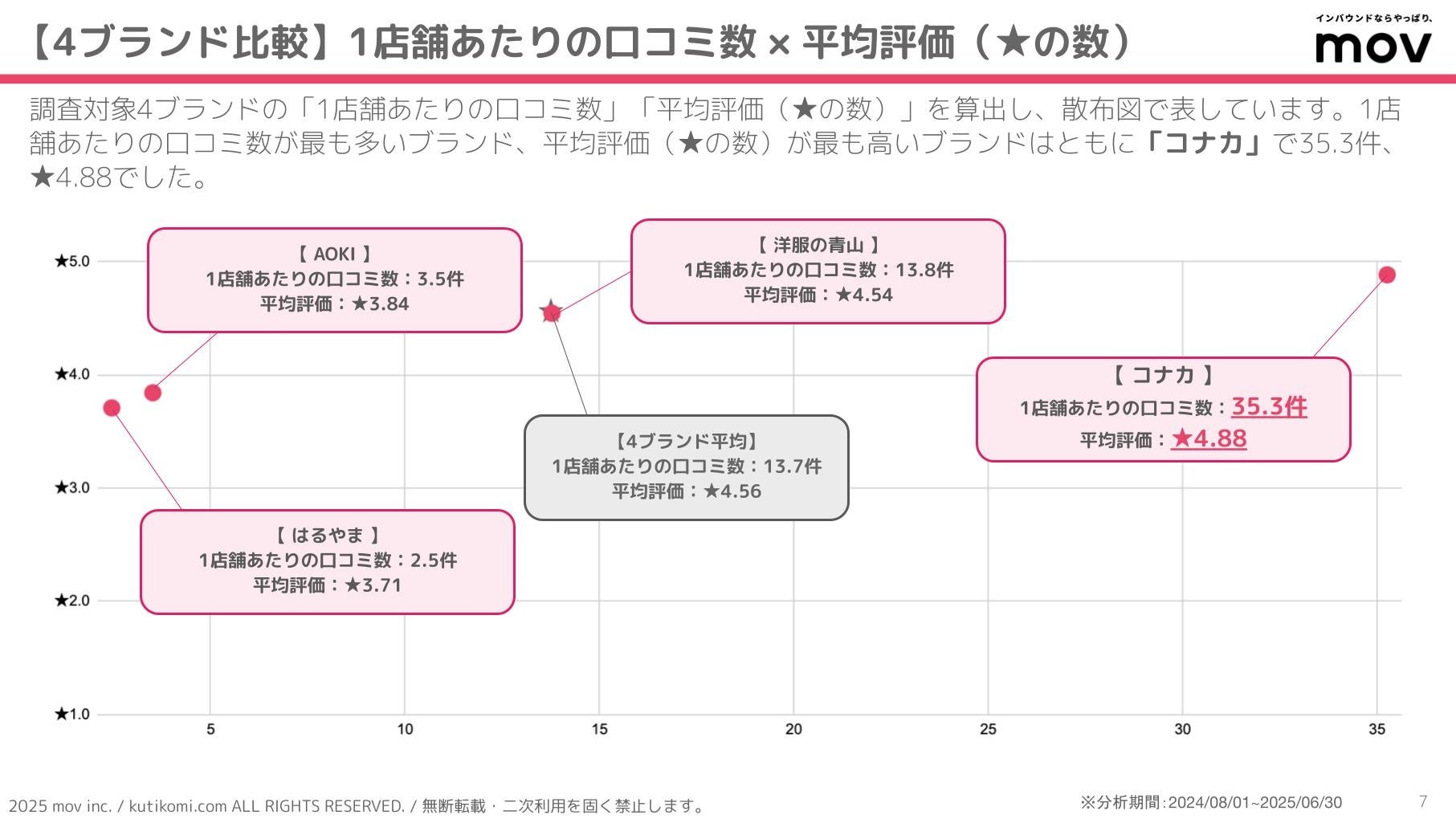 こちらの散布図では、調査対象4ブランドの「1店舗あたりの口コミ数」「平均評価(★の数)」を算出しています。1店舗あたりの口コミ数が最も多いブランド、平均評価(★の数)が最も高いブランドはともに「コナカ」で35.3件、★4.88でした。