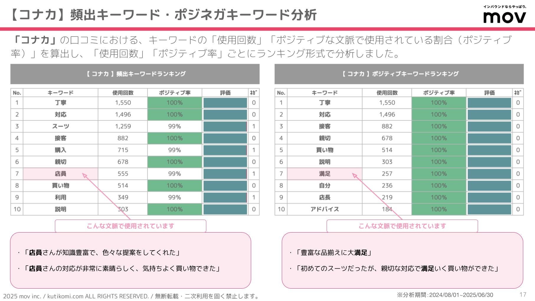 こちらの表では、「コナカ」の口コミにおける、キーワードの「使用回数」「ポジティブな文脈で使用されている割合(ポジティブ率)」を算出し、「使用回数」「ポジティブ率」ごとにランキング形式で分析しています。