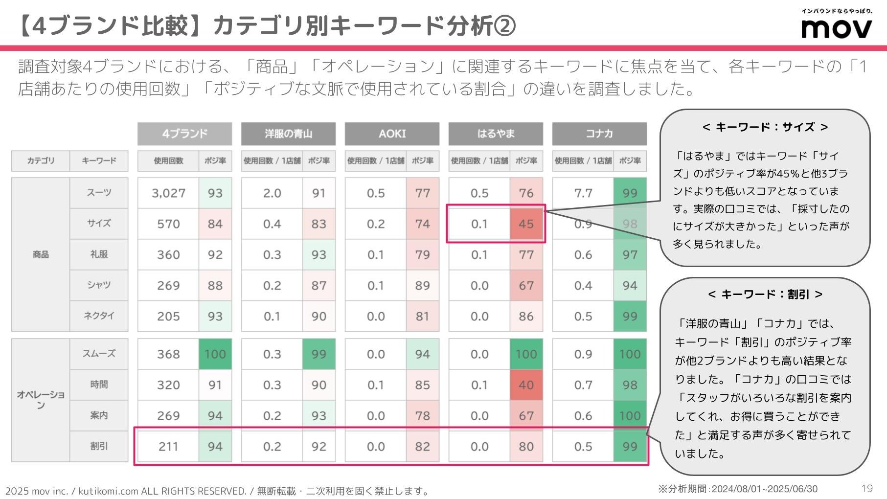 「洋服の青山」「コナカ」では、キーワード「割引」のポジティブ率が高い結果に
