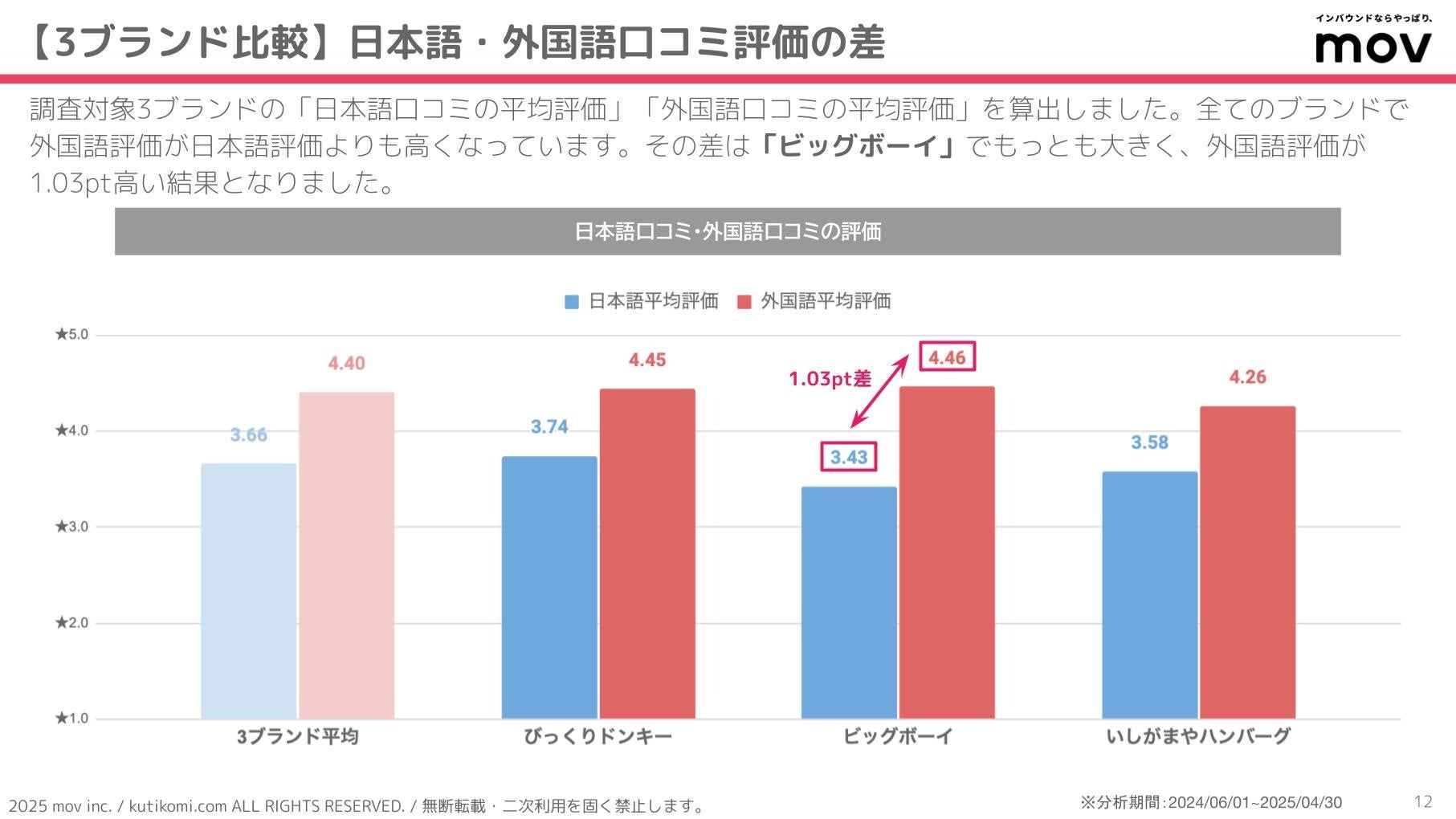 こちらのグラフでは、調査対象3ブランドの「日本語口コミの平均評価」「外国語口コミの平均評価」を算出しています。全てのブランドで外国語評価が日本語評価よりも高くなっています。その差は「ビッグボーイ」でもっとも大きく、外国語評価が1.03pt高い結果となりました。