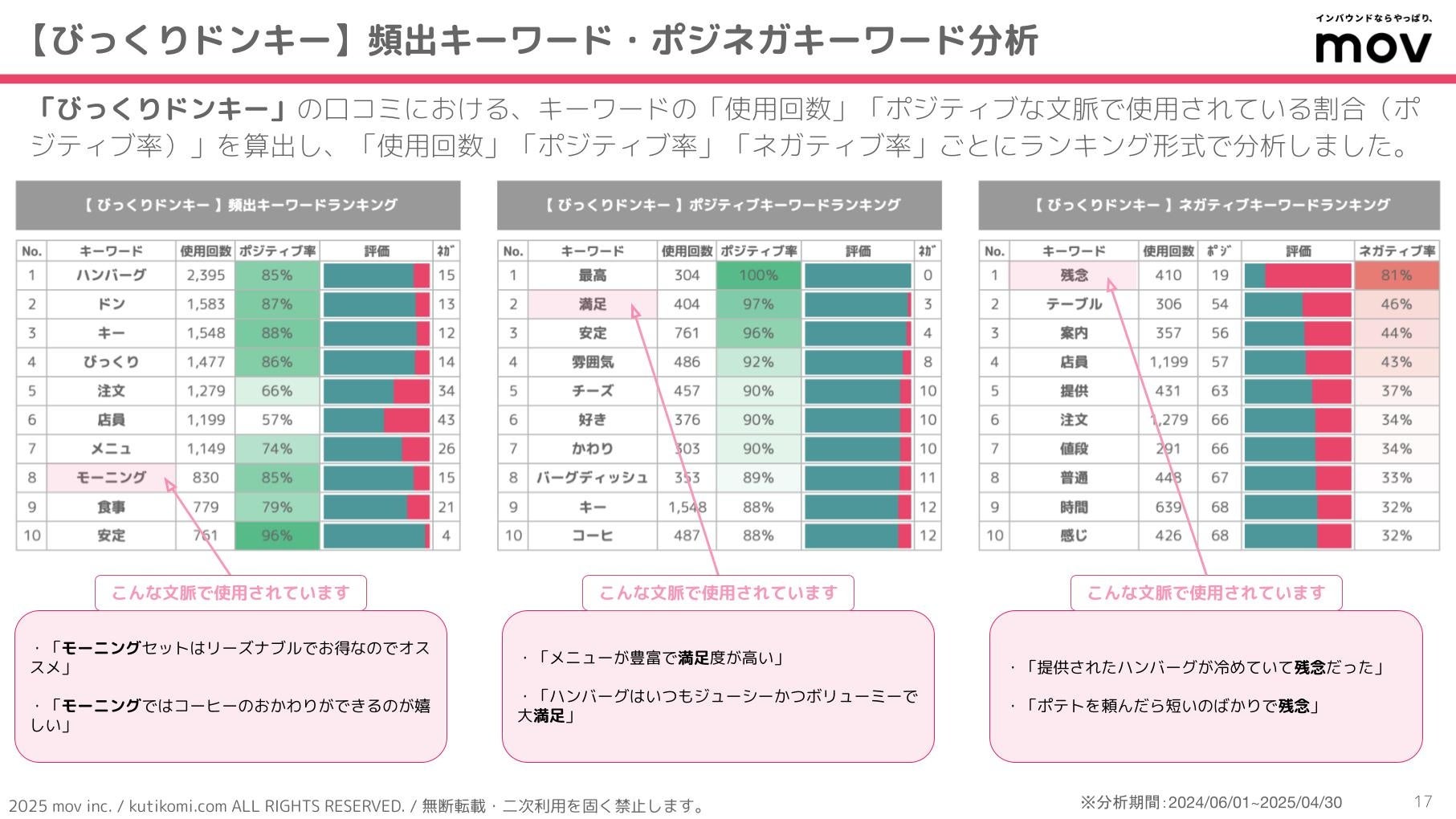 こちらの表では、「びっくりドンキー」の口コミにおける、キーワードの「使用回数」「ポジティブな文脈で使用されている割合(ポジティブ率)」を算出し、「使用回数」「ポジティブ率」「ネガティブ率」ごとにランキング形式で分析しています。