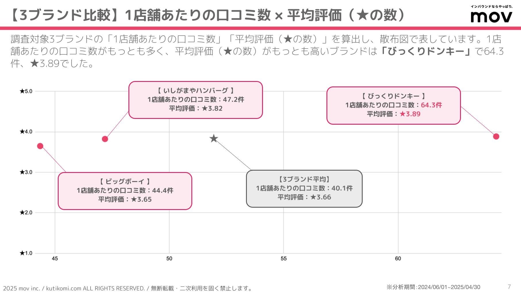 こちらの散布図では、調査対象3ブランドの「1店舗あたりの口コミ数」「平均評価(★の数)」を算出しています。1店舗あたりの口コミ数がもっとも多く、平均評価(★の数)がもっとも高いブランドは「びっくりドンキー」で64.3件、★3.89でした。