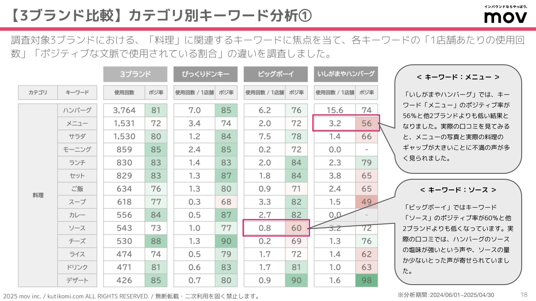 こちらの表では、調査対象3ブランドにおける、「料理」に関連するキーワードに焦点を当て、各キーワードの「1店舗あたりの使用回数」「ポジティブな文脈で使用されている割合」の違いを調査しています。