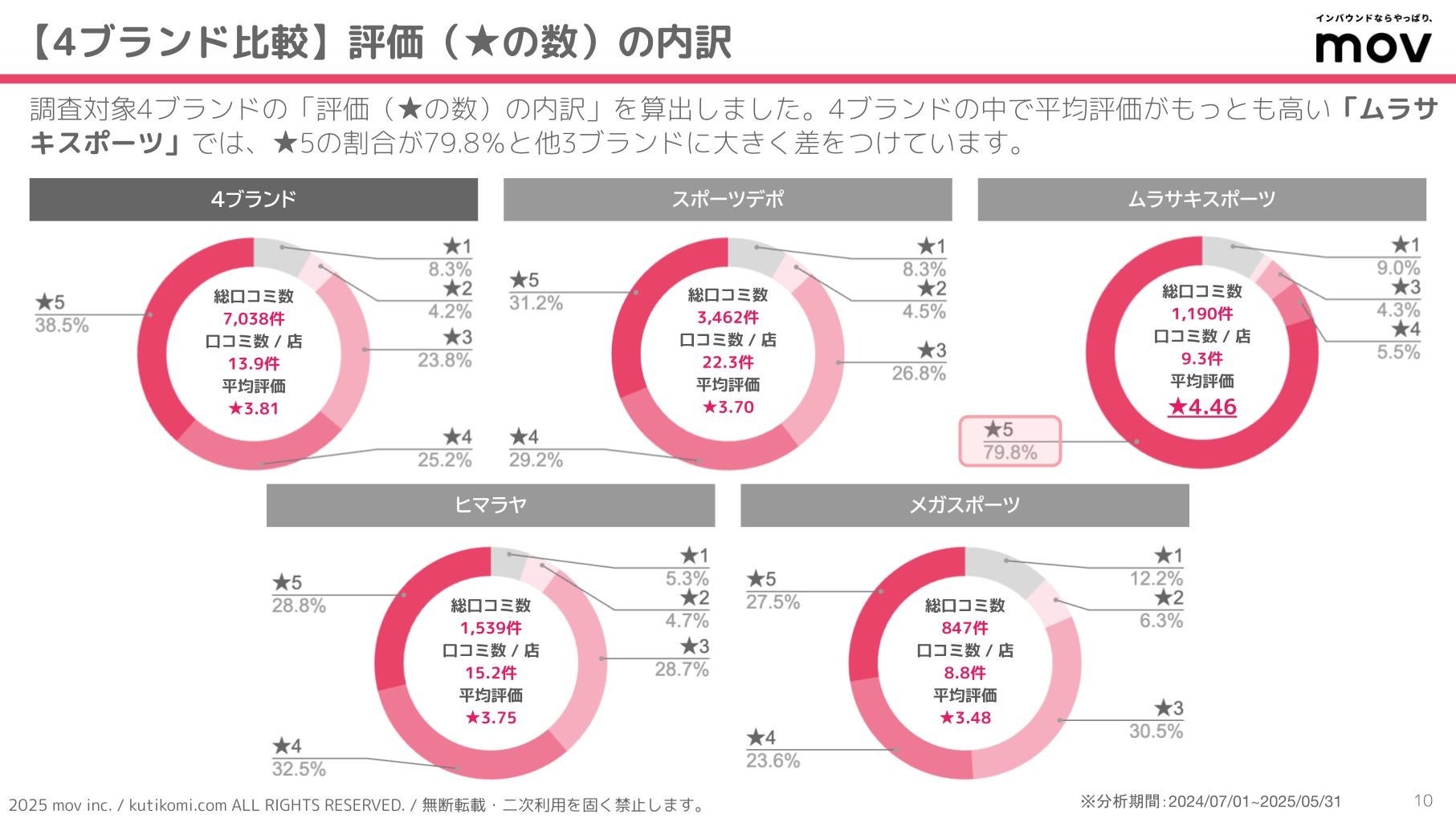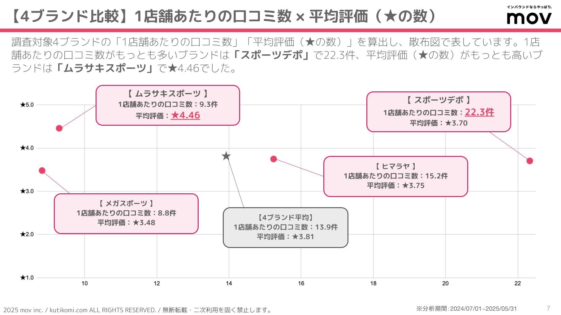 1店舗あたりの口コミ数が多いのは「スポーツデポ」、平均評価が高いのは「ムラサキスポーツ」