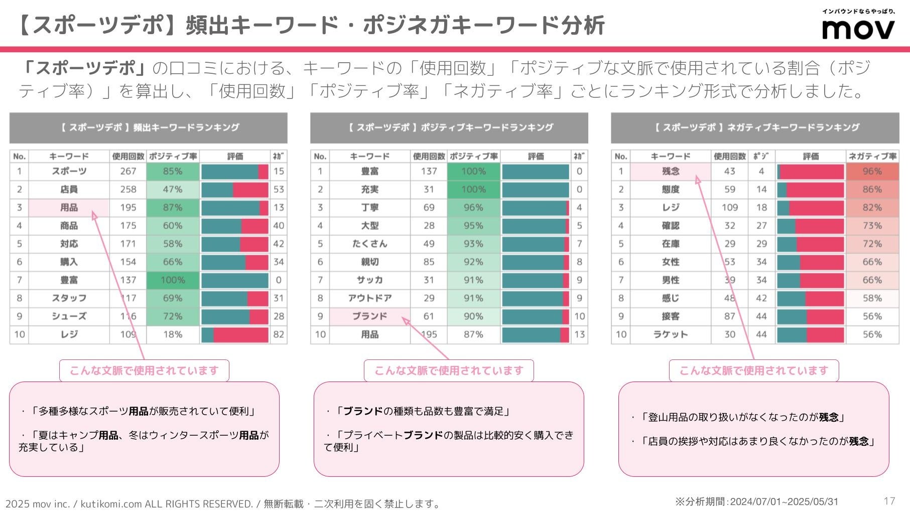 こちらの表では、「スポーツデポ」の口コミにおける、キーワードの「使用回数」「ポジティブな文脈で使用されている割合(ポジティブ率)」を算出し、「使用回数」「ポジティブ率」「ネガティブ率」ごとにランキング形式で分析しています。