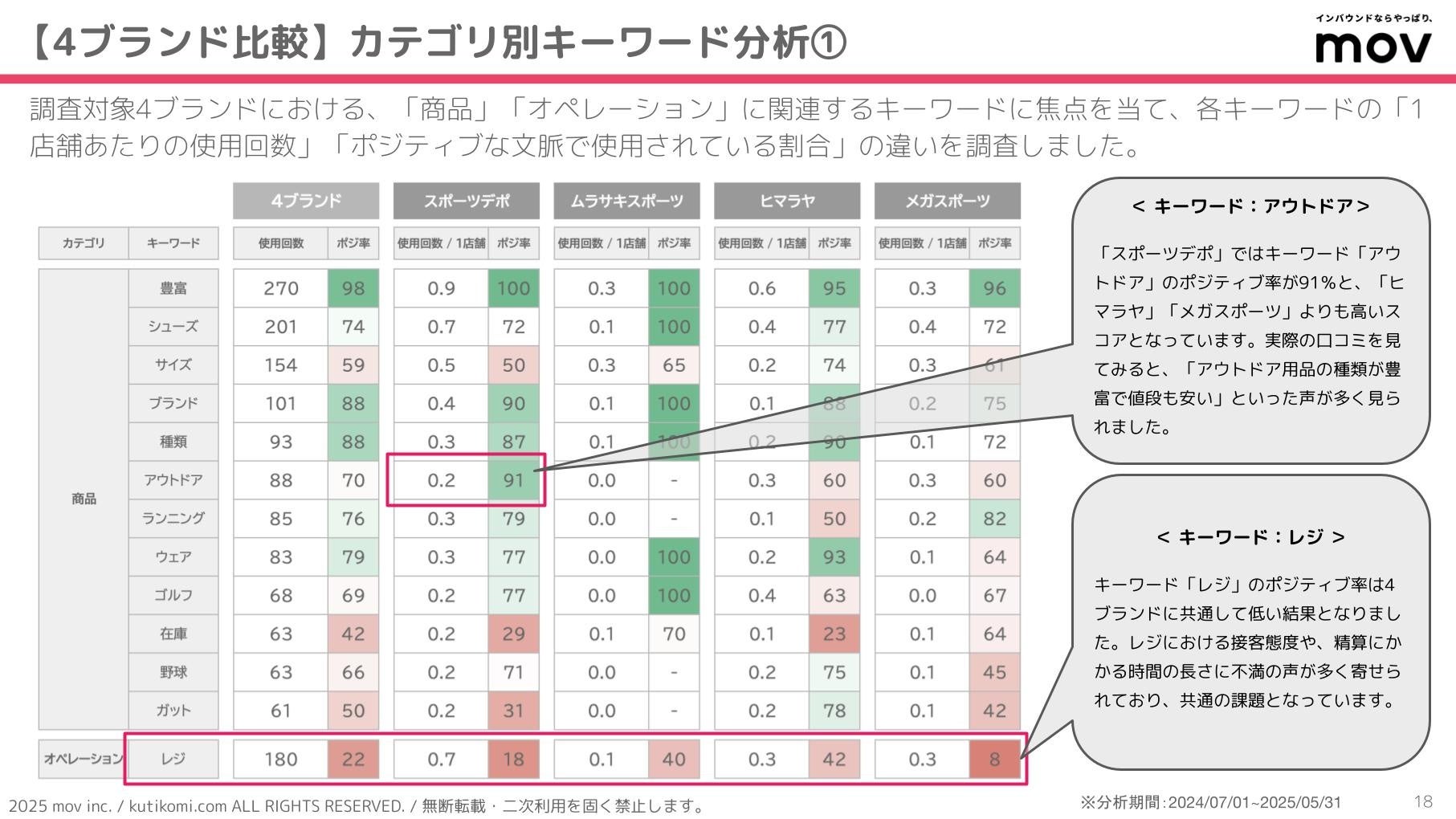 こちらの表では、調査対象4ブランドにおける、「商品」「オペレーション」に関連するキーワードに焦点を当て、各キーワードの「1店舗あたりの使用回数」「ポジティブな文脈で使用されている割合」の違いを調査しています。
