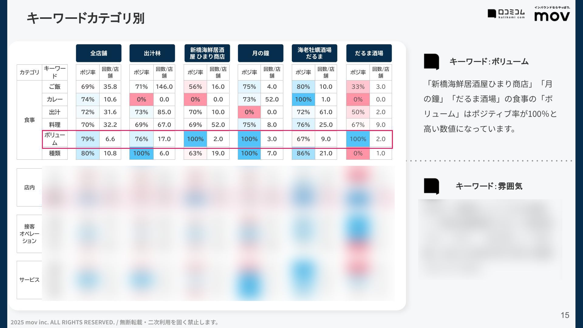 「ボリューム」「料理」など食事に関するキーワードは、各店舗ポジティブな評価が多い一方で、「雰囲気」といった店舗での体験では店舗によって評価にばらつきが見られました。