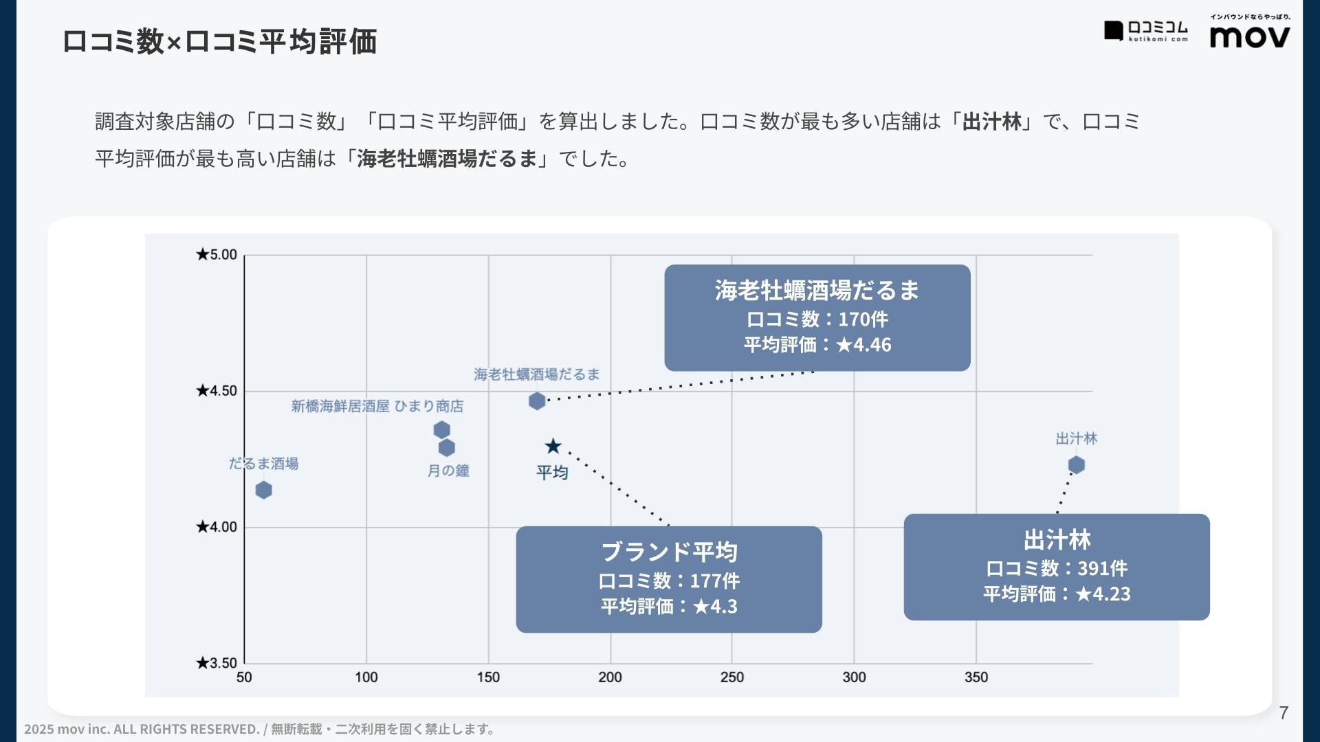 調査対象店舗の「口コミ数」「口コミ平均評価」を算出しました。口コミ数が最も多く、口コミ平均評価が最も高いブランドは「海老牡蠣酒場だるま」でした。