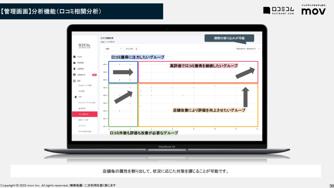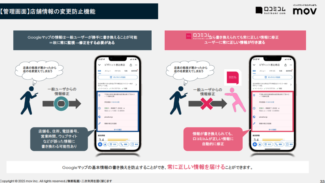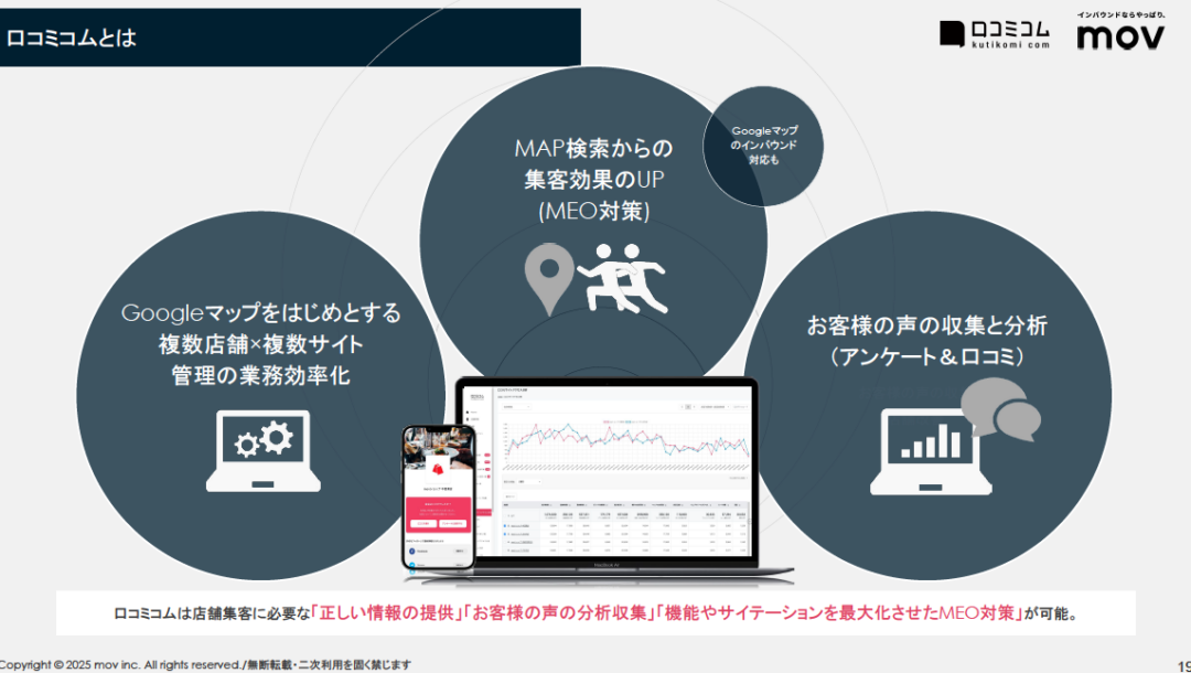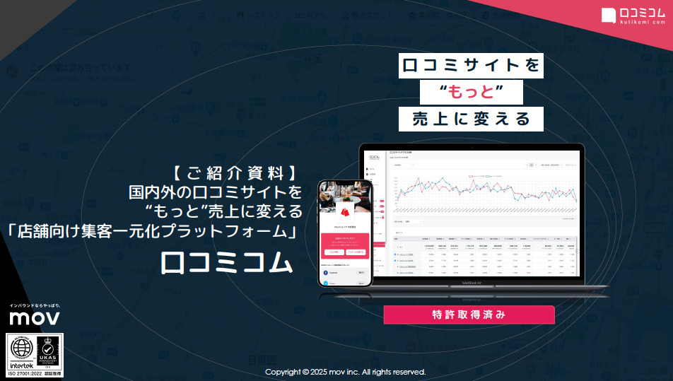 資料ダウンロード 口コミサイトを “もっと” 売上に変える「口コミコム」サービス紹介資料 口コミサイトを “もっと” 売上に変える「口コミコム」は、Googleビジネスプロフィールは初め連携サイト多数。 一元管理だけではなく店舗の売上に寄与できるプロダクトをご提供し、多くのお客様にご利用いただいてます。 必要事項をご入力の上「送信する」ボタンを押して下さい。ご入力頂いたメールアドレス宛に、資料がダウンロード出来るURLをお送り致します。*は必須項目です。 会社名* 部署名* 役職* お名前* メールアドレス* 電話番号* 店舗数* 選択してください1〜5店舗6〜50店舗51〜300店舗301店舗以上 店舗ブランド名* 業種* ※頂いたご連絡先は当社の業務委託先に提供され、当社もしくは業務委託先からご連絡することがあります。 ※頂いたメールアドレス宛に当社運営の「口コミコム」「訪日ラボ」からメールマガジンを送付することがあります。 上記および利用規約・プライバシーポリシーに同意
